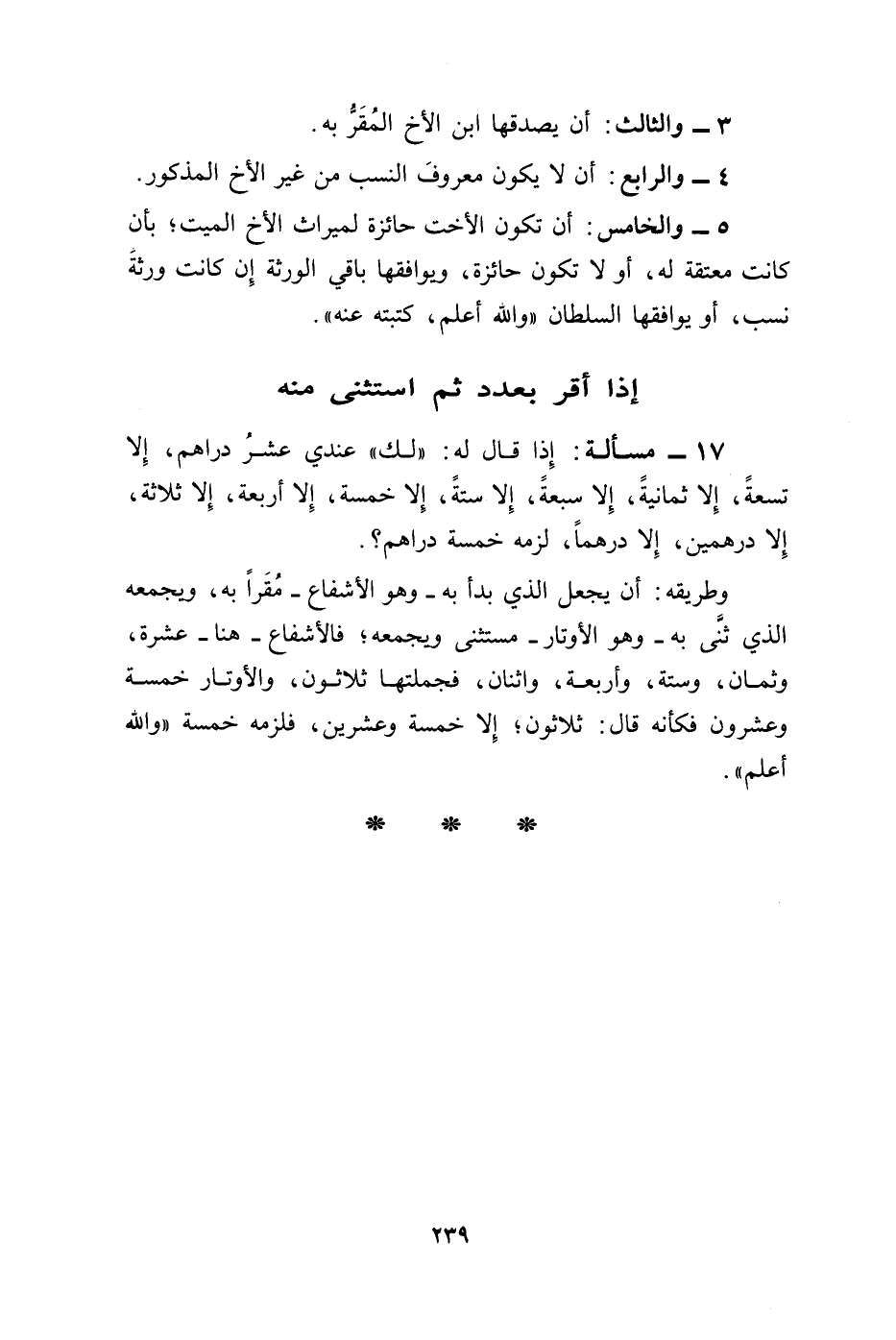 وطريقه: أن يجعل الذي بدأ به -وهو الأشفاع- مُقَرًا به، ويجمعه الذي ثنى به -وهو الأوتار- مستثنى ويجمعه؛ فالأشفاع -هنا- عشرة، وثمان، وستة، وأربعة، واثنان، فجملتها ثلاثون، والأوتار خمسة وعشرون فكأنه قال: ثلاثون؛ إِلا خمسة وعشرين، فلزمه خمسة "والله أعلم".