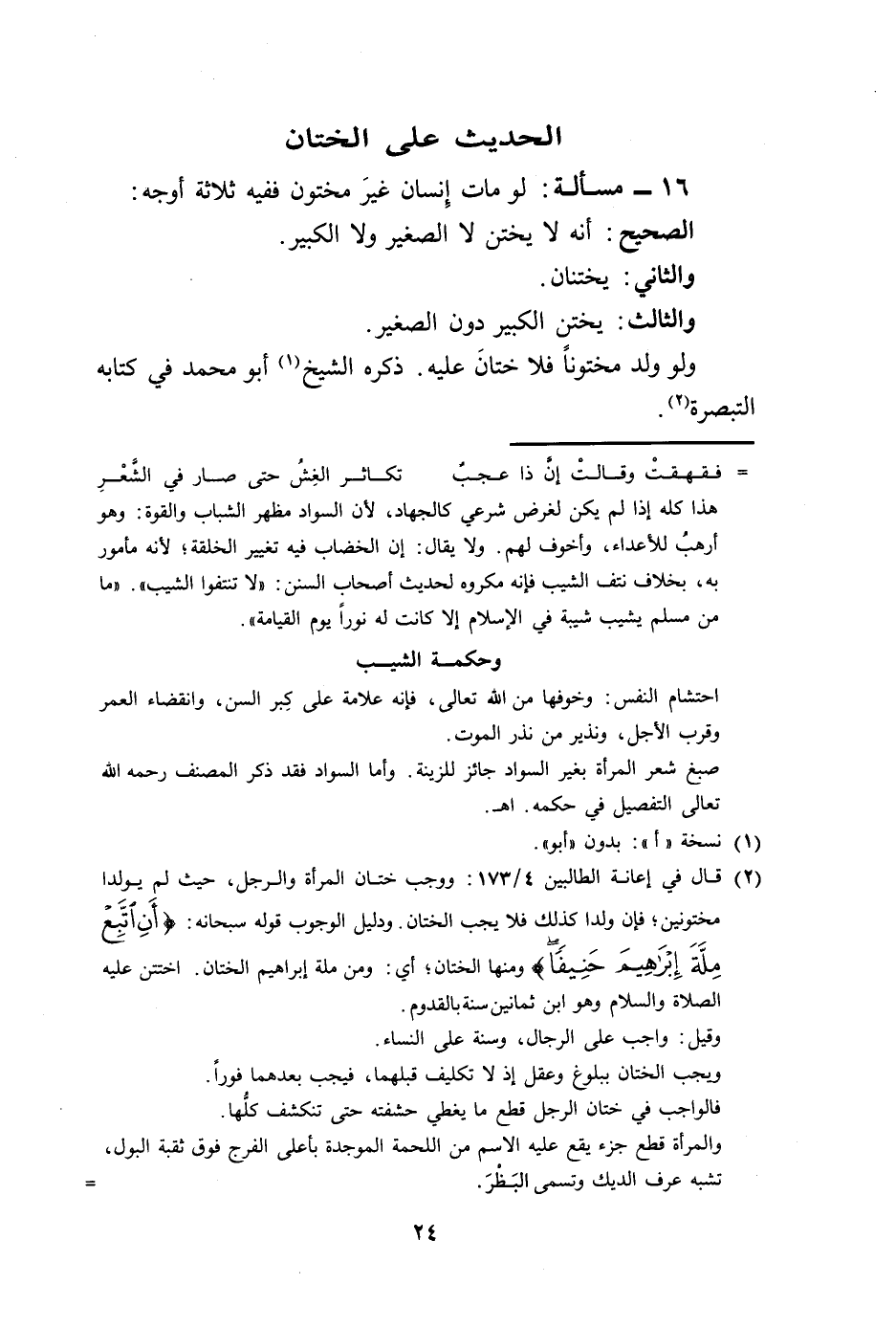 16 - مسألة: لو مات إِنسان غيرَ مختون ففيه ثلاثة أوجه: