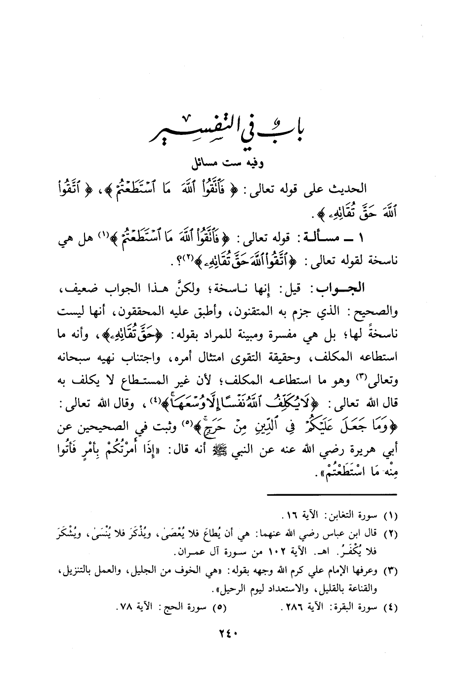 1 - مسألة: قوله تعالى: {فَاتَّقُوا اللَّهَ مَا اسْتَطَعْتُمْ} (¬1) هل هي ناسخة لقوله تعالى: {اتَّقُوا اللَّهَ حَقَّ تُقَاتِهِ} (¬2)؟.