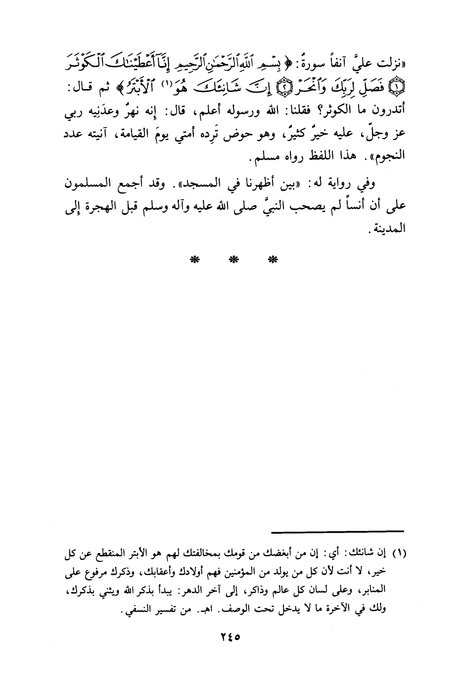 "نزلت عليَّ آنفًا سورةٌ: بِسْمِ اللَّهِ الرَّحْمَنِ الرَّحِيمِ {إِنَّا أَعْطَيْنَاكَ الْكَوْثَرَ (1) فَصَلِّ لِرَبِّكَ وَانْحَرْ (2) إِنَّ شَانِئَكَ هُوَ (¬1) الْأَبْتَرُ (3)} ثم قال: أتدرون ما الكوثر؟ فقلنا: الله ورسوله أعلم، قال: إِنه نهر وعدَنِيه ربي عز وجل، عليه خيرٌ كثيرٌ، وهو حوض تَرِده أمتي يومَ القيامة، آنيته عدد النجوم". هذا اللفظ رواه مسلم.