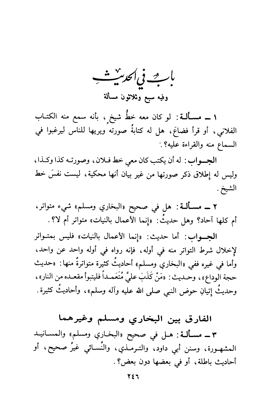 3 - مسألة: هل في صحيح "البخاري ومسلم" والمسانيد المشهورة، وسنن أبي داود، والترمذي، والنَّسائي غيرُ صحيح، أو أحاديث باطلة، أو في بعضها دون بعض؟.