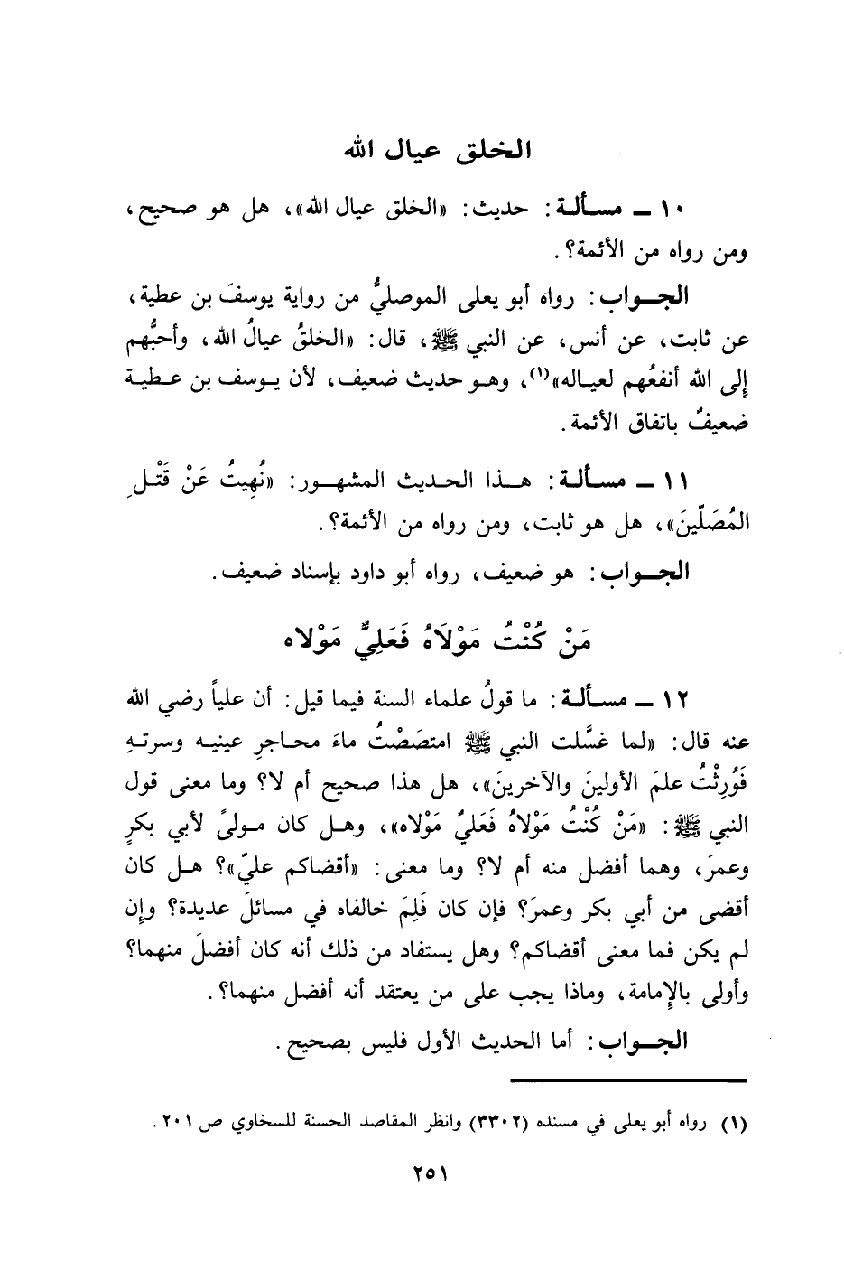 10 - مسالة: حديث: "الخلق عيال الله"، هل هو صحيح، ومن رواه من الأئمة؟.