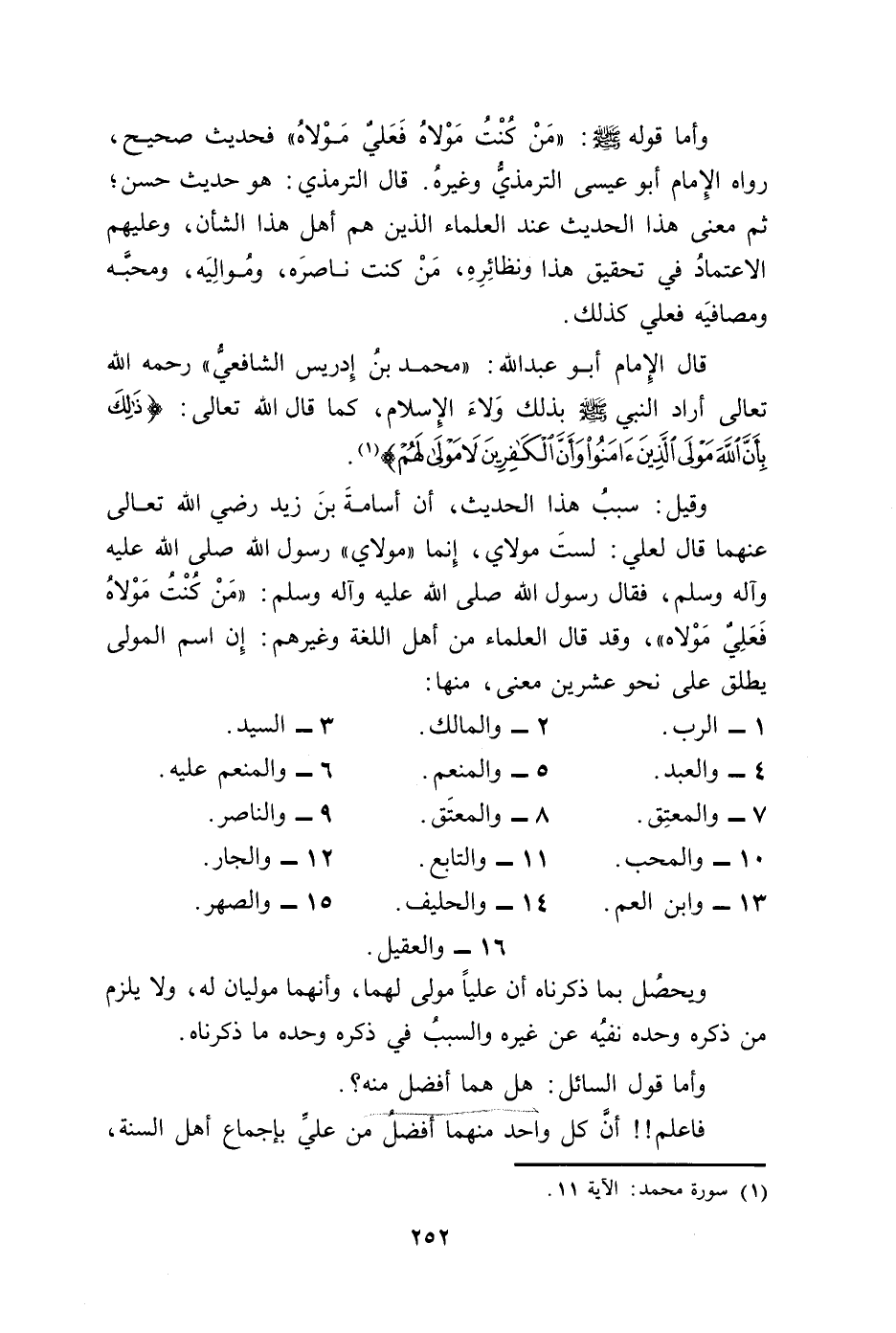 وأما قوله - صلى الله عليه وسلم -: "مَنْ كُنْتُ مَوْلاهُ فَعَليٌ مَوْلاهُ" فحديث صحيح، رواه الِإمام أبو عيسى الترمذيُّ وغيرهُ. قال الترمذي: هو حديث حسن؛ ثم معنى هذا الحديث عند العلماء الذين هم أهل هذا الشأن، وعليهم الاعتمادُ في تحقيق هذا ونظائِرِهِ، مَنْ كنت ناصرَه، ومُوالِيَه، ومحبَّه ومصافيَه فعلي كذلك.
