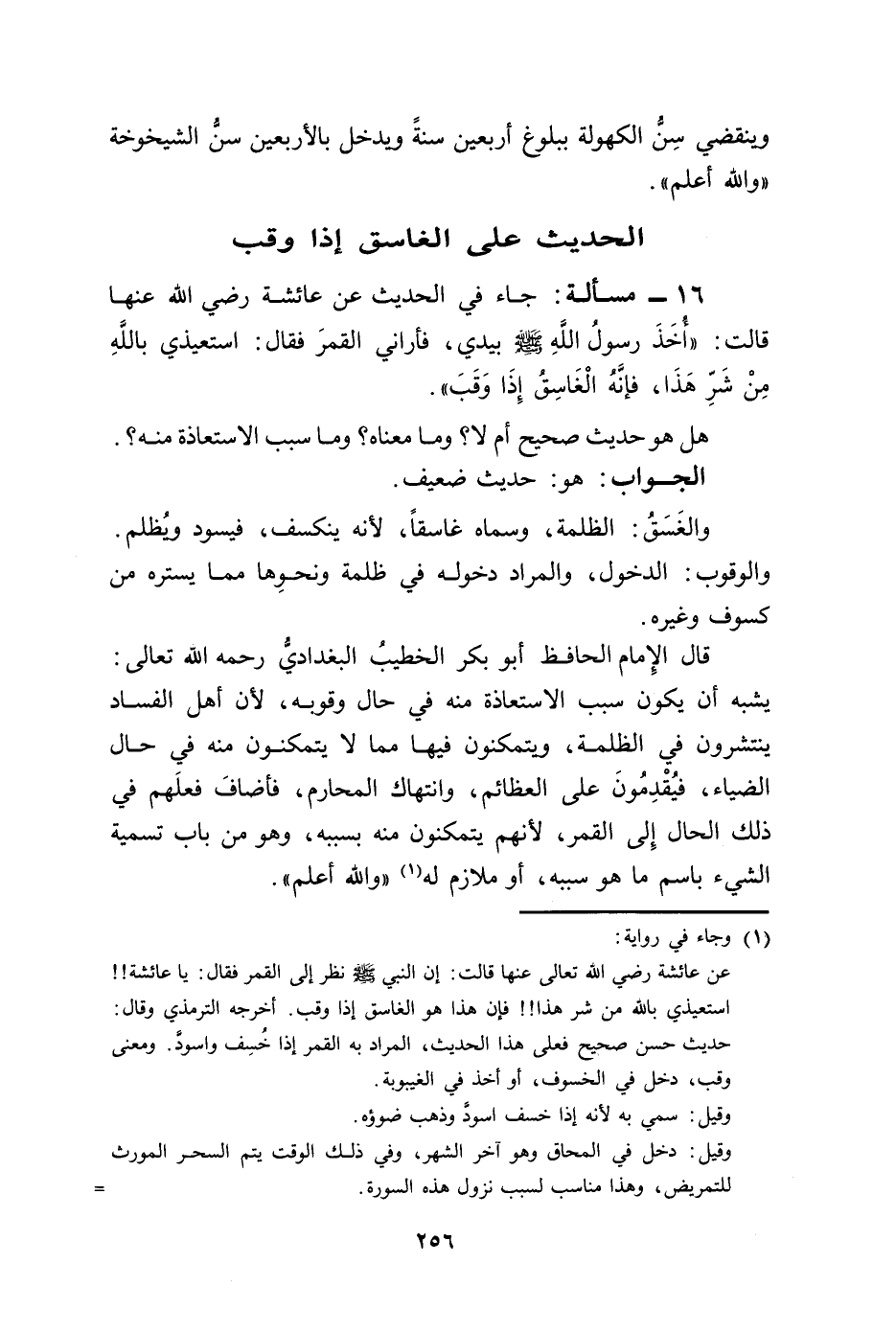16 - مسألة: جاء في الحديث عن عائشة رضي الله عنها قالت: "أُخَذَ رسولُ اللهِ - صلى الله عليه وسلم - بيدي، فأراني القمرَ فقال: استعيذي باللهِ مِنْ شَرِّ هَذَا، فإنَّهُ الْغَاسِقُ إِذَا وَقَبَ".