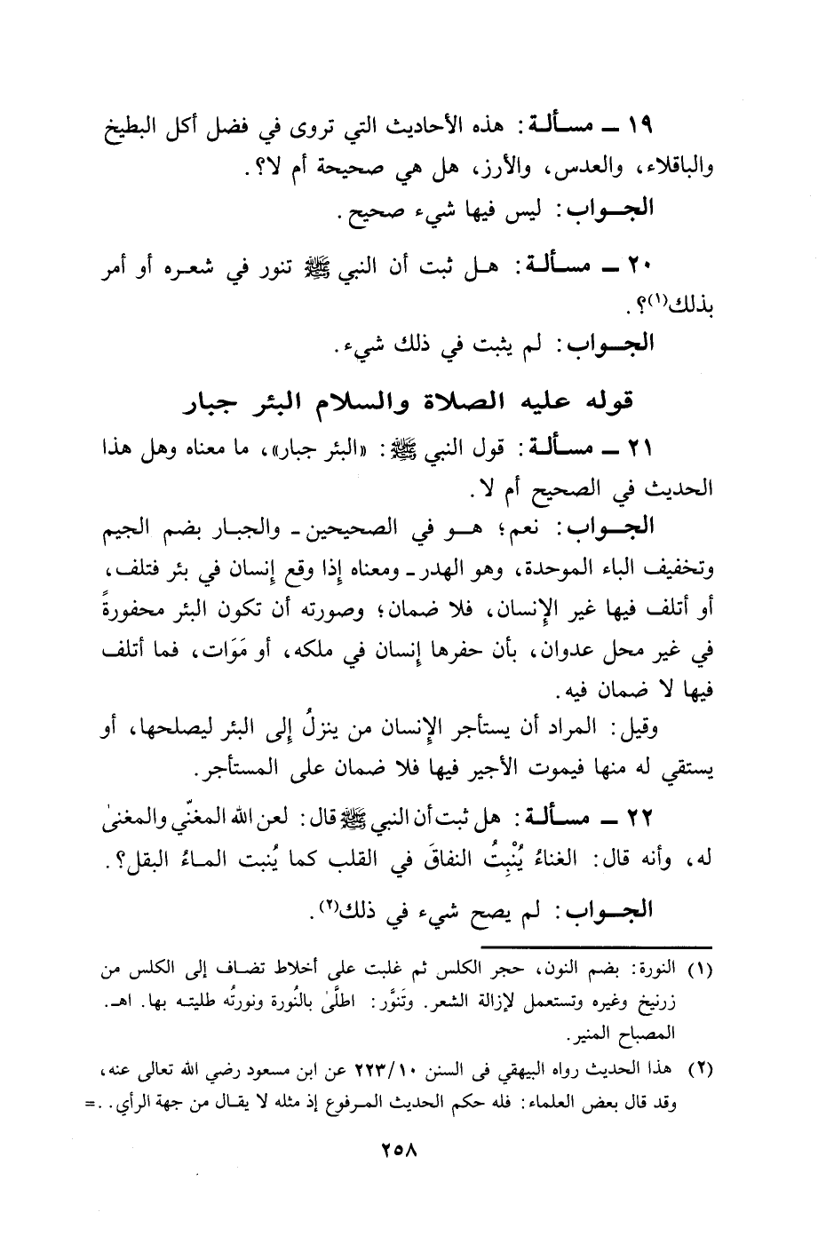 19 - مسألة: هذه الأحاديث التي تروى في فضل أكل البطيخ والباقلاء، والعدس، والأرز، هل هي صحيحة أم لا؟.