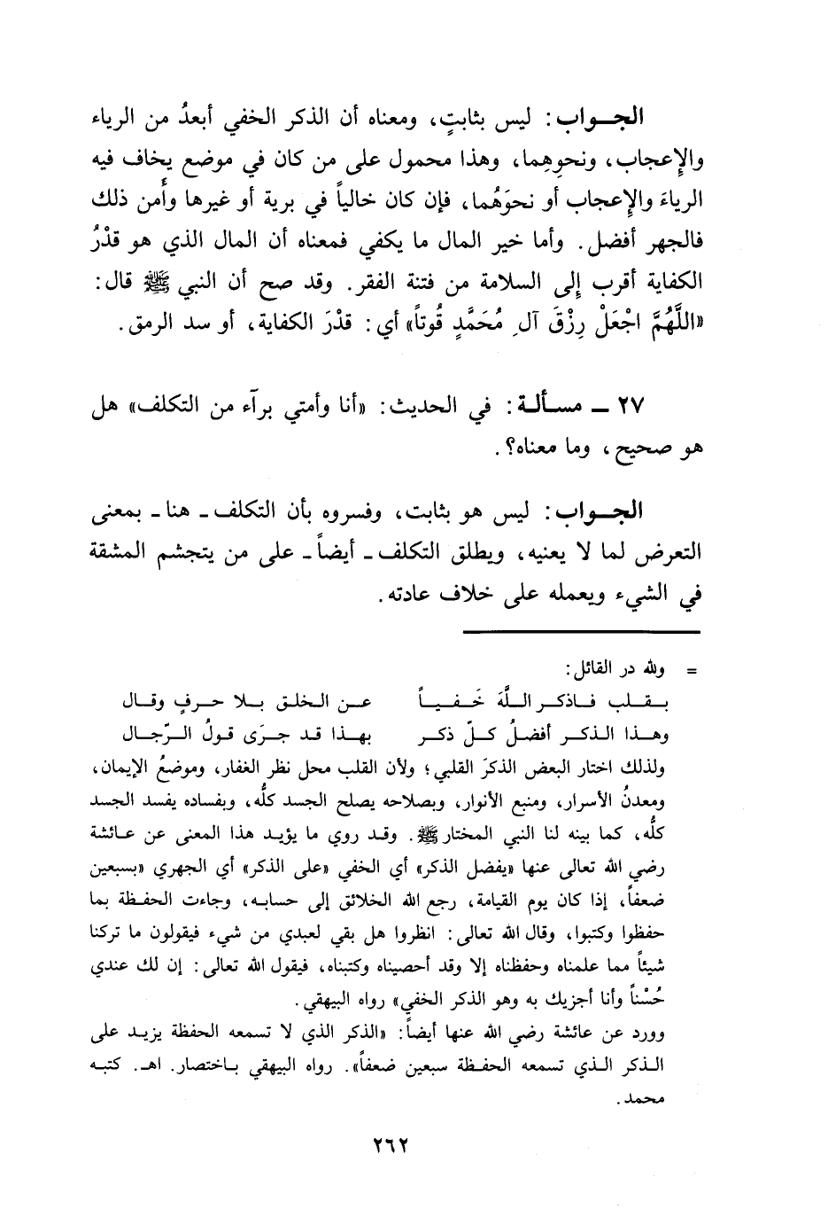 الجواب: ليس بثابتٍ، ومعناه أن الذكر الخفي أبعدُ من الرياء والِإعجاب، ونحوِهِما، وهذا محمول على من كان في موضع يخاف فيه الرياءَ والِإعجاب أو نحوِهِما، فإن كان خاليًا في برية أو غيرها وأَمن ذلك فالجهر أفضل. وأما خير المال ما يكفي فمعناه أن المال الذي هو قدْرُ الكفاية أقرب إِلى السلامة من فتنة الفقر. وقد صح أن النبي - صلى الله عليه وسلم - قال: "اللَّهُمَّ اجْعَلْ رِزْقَ آلِ مُحَمَّدٍ قُوتًا" أي: قدْرَ الكفاية، أو سد الرمق.