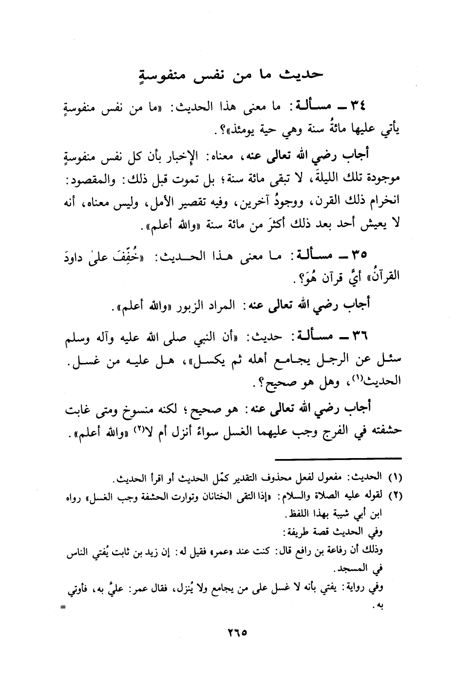 34 - مسألة: ما معنى هذا الحديث: "ما من نفس منفوسةٍ يأتي عليها مائةُ سنة وهي حية يومئذ"؟.