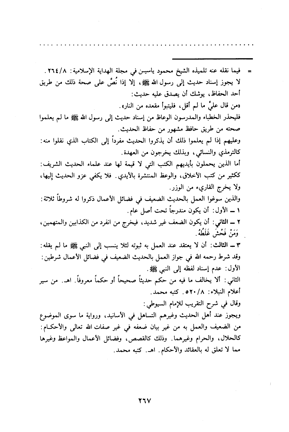 وقال في شرح التقريب للإمام السيوطي: ويجوز عند أهل الحديث وغيرهم التساهل في الأسانيد، ورواية ما سوى الموضوع من الضعيف والعمل به من غير بيان ضعفه في غير صفات الله تعالى والأحكام: كالحلال، والحرام وغيرهما. وذلك كالقصص، وفضائل الأعمال والمواعظ وغيرها مما لا تعلق له بالعقائد والأحكام. اهـ. كتبه محمد.