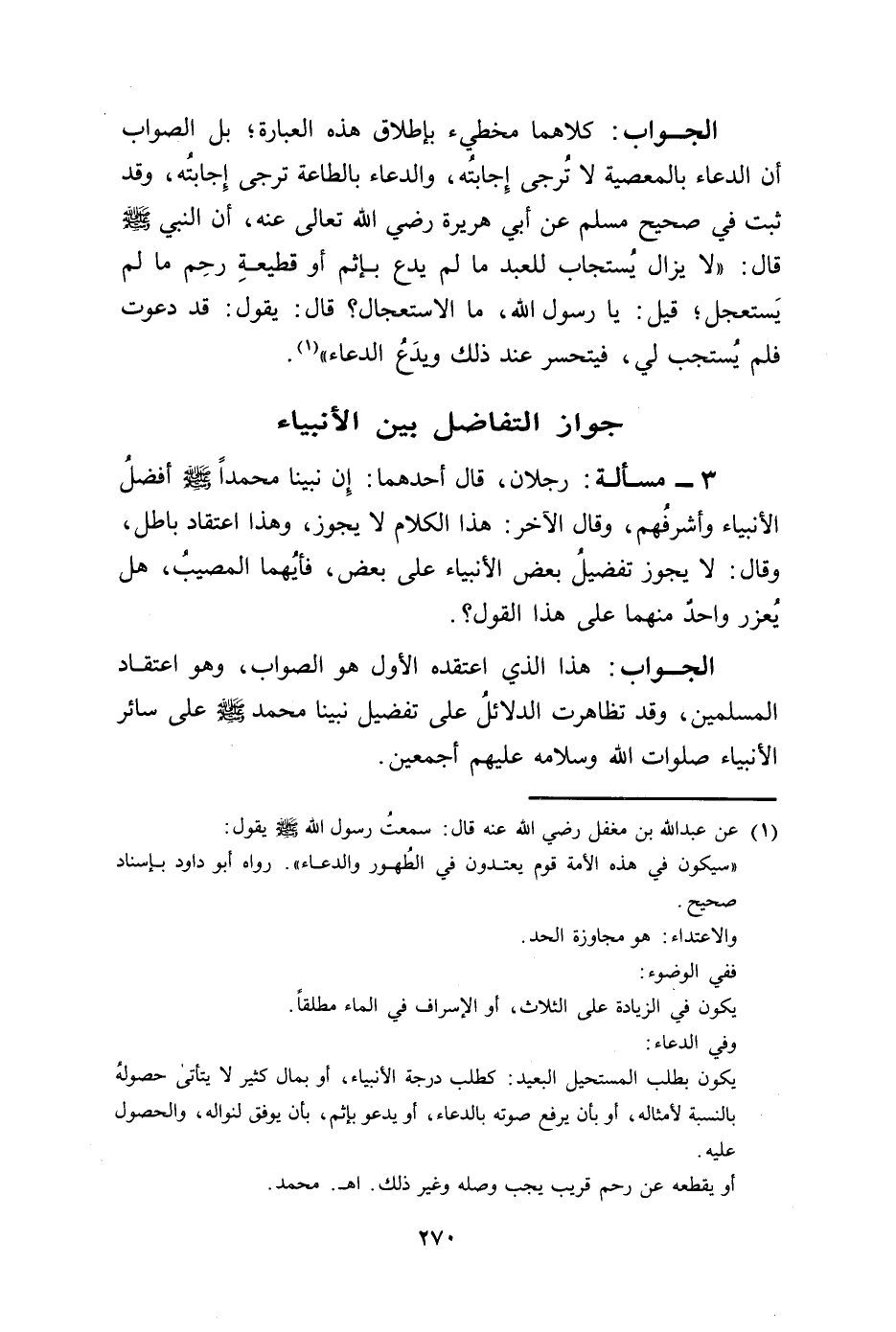 3 - مسألة: رجلان، قال أحدهما: إِن نبينا محمدًا - صلى الله عليه وسلم - أفضلُ الأنبياء وأشرفُهم، وقال الآخر: هذا الكلام لا يجوز، وهذا اعتقاد باطل، وقال: لا يجوز تفضيلُ بعض الأنبياء على بعض، فأيُهما المصيبُ، هل يُعزر واحدٌ منهما على هذا القول؟.