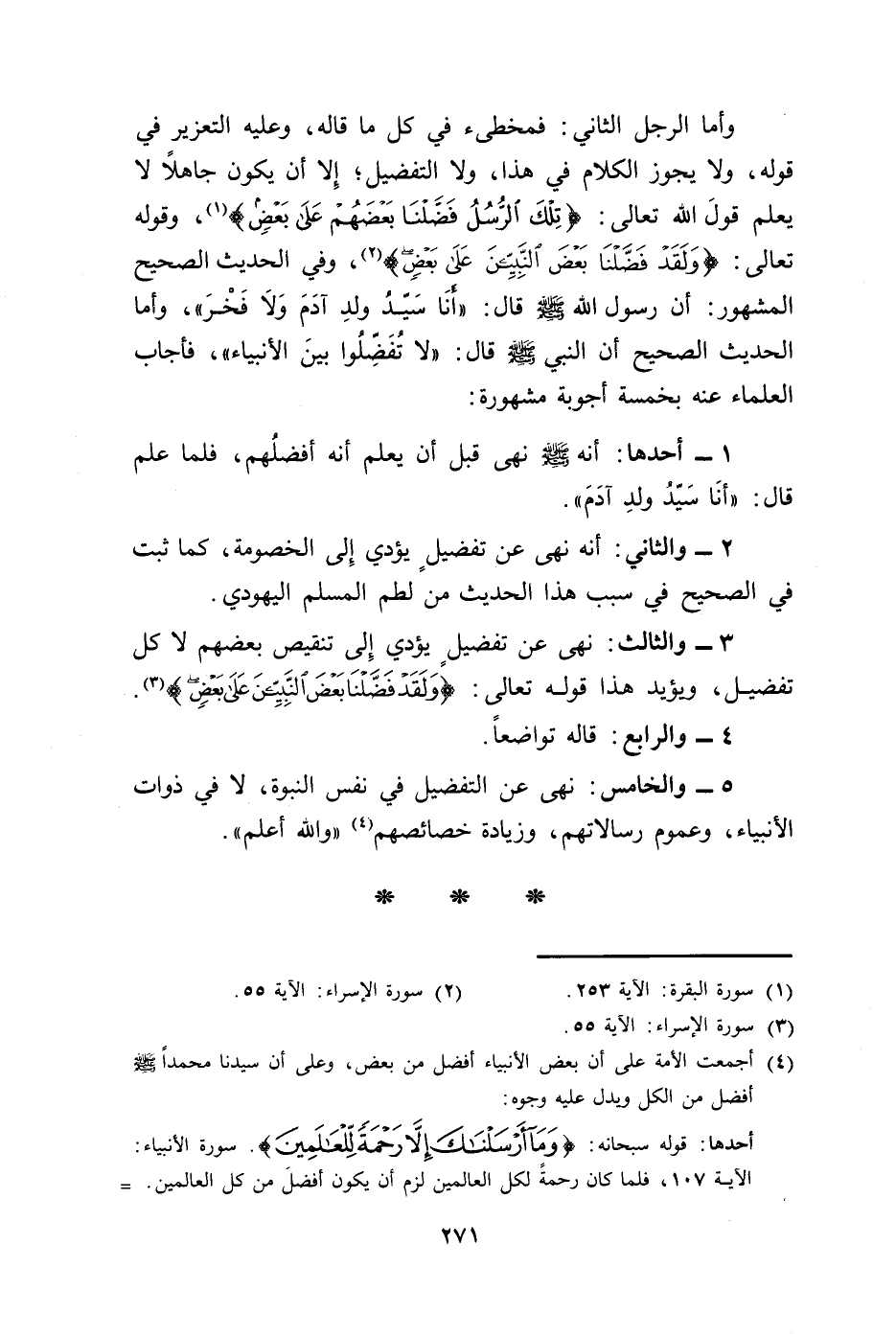 وأما الرجل الثاني: فمخطىء في كل ما قاله، وعليه التعزير في قوله، ولا يجوز الكلام في هذا، ولا التفضيل؛ إِلا أن يكون جاهلًا لا يعلم قولَ الله تعالى: {تِلْكَ الرُّسُلُ فَضَّلْنَا بَعْضَهُمْ عَلَى بَعْضٍ} (¬1)، وقوله تعالى: {وَلَقَدْ فَضَّلْنَا بَعْضَ النَّبِيِّينَ عَلَى بَعْضٍ} (¬2)، وفي الحديث الصحيح المشهور: أن رسول الله - صلى الله عليه وسلم - قال: "انا سَيّدُ ولدِ آدَمَ وَلَا فَخْرَ"، وأما الحديث الصحيح أن النبي - صلى الله عليه وسلم - قال: "لا تفَضِّلُوا بينَ الأنبياء"، فأجاب العلماء عنه بخمسة أجوبة مشهورة:
