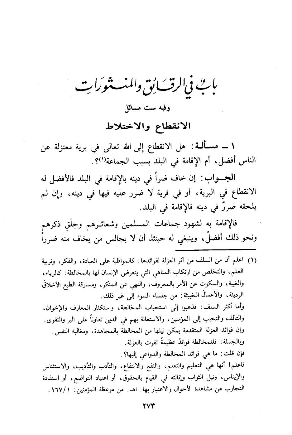 1 - مسألة: هل الانقطاع إِلى الله تعالى في برية معتزلة عن الناس أفضل، أم الإِقامة في البلد بسبب الجماعة (¬1)؟.