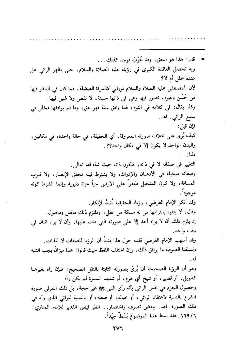 وبه تحصل الفائدة الكبرى في رؤياه عليه الصلاة والسلام، حتى يظهر الرائي هل عنده خلل أم لا؟.