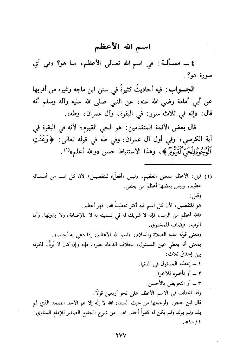 4 - مسألة: في اسم الله تعالى الأعظم، ما هو؟ وفي أي سورة هو؟.