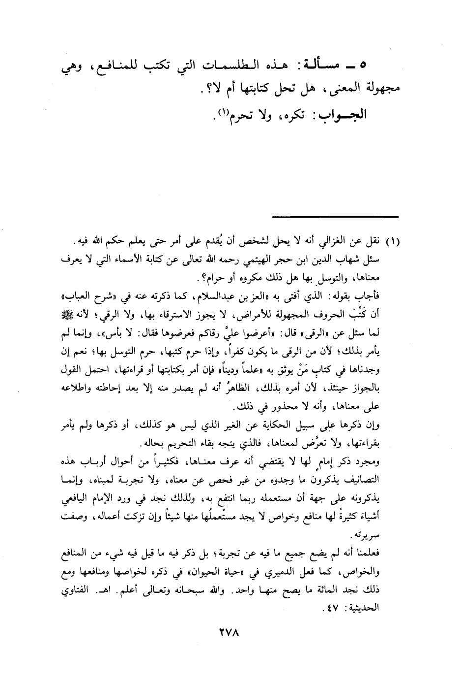 5 - مسألة: هذه الطلسمات التي تكتب للمنافع، وهي مجهولة المعنى، هل تحل كتابتها أم لا؟.