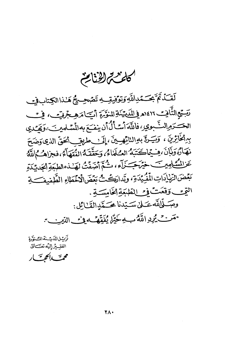 لَقَدْ تَمَّ بحَمدِ اللهِ وَتوفيقِهِ تَصحِيحُ هَذا الكِتاب في رَبيعٍ الثَّاني 1416 هـ في المَدينَةِ المنوَّرَة أيَّامَ هِجرتي، في الحَرمِ النَّبويِ، فاللهَ أسألُ أن ينفَعَ به المسلمينَ، وَيَهدي به الحَائِرينَ، وَيَردَّ بهِ التائِهِينَ، إلَى طريقِ الحَقّ الذي وَضَحَ نهَارُه وَبَانَ، فِيما كَتَبَهُ العُلمَاءُ، وَحَقَّقَهُ الفُقهَاءُ، فجزاهُمُ اللهُ عَن المُسلمِينَ خيرَ جَزَاء، ثُمَّ أضَفتُ لهَذه الطبعَةِ الجَديدَةِ بَعضَ الزّيادَاتِ المُفِيدَةِ، وتَدارَكتُ بَعضَ الأخطَاءِ الطَّفيفَةِ التي وَقعَت في الطّبعَةِ الخَامِسَةِ.