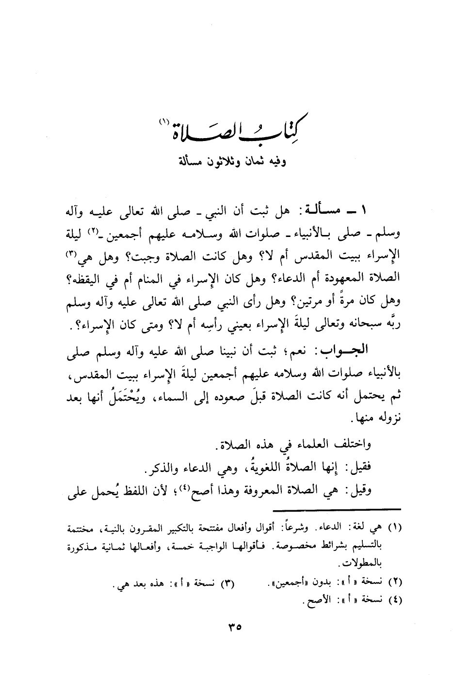 1 - مسألة: هل ثبت أن النبي -صلى الله تعالى عليه وآله وسلم- صلى بالأنبياء -صلوات الله وسلامه عليهم أجمعين- (¬2) ليلة الِإسراء ببيت المقدس أم لا؟ وهل كانت الصلاة وجبت؟ وهل هي (¬3) الصلاة المعهودة أم الدعاء؟ وهل كان الِإسراء في المنام أم في اليقظه؟ وهل كان مرةً أو مرتين؟ وهل رأى النبي صلى الله تعالى عليه وآله وسلم ربَّه سبحانه وتعالى ليلةَ الِإسراء بعيني رأسِه أم لا؟ ومتى كان الِإسراء؟.