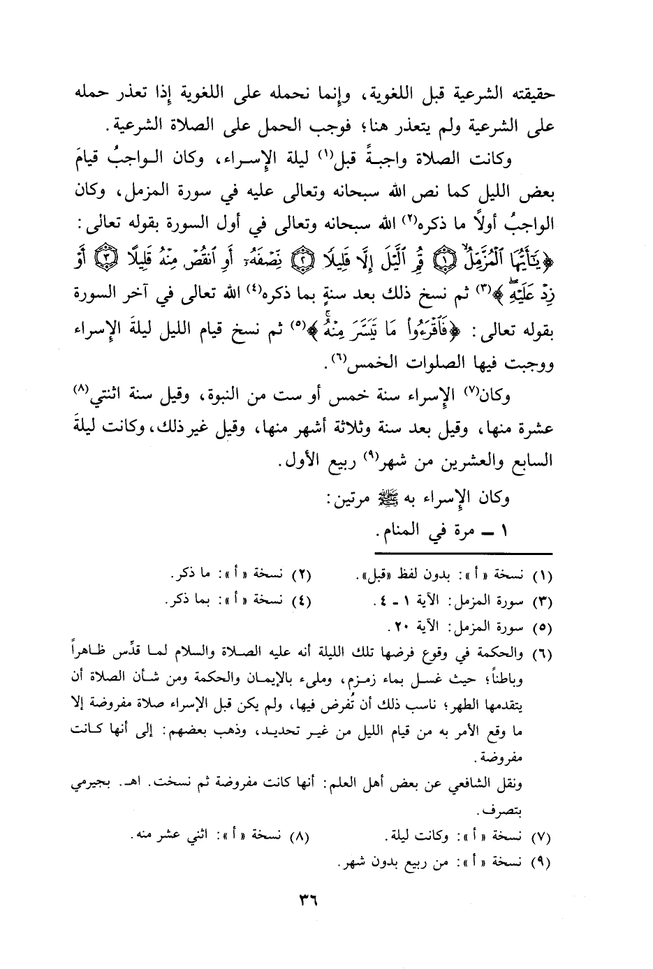 (¬6) والحكمة في وقوع فرضها تلك الليلة أنه عليه الصلاة والسلام لما قدَّس ظاهرًا وباطنًا؛ حيث غسل بماء زمزم، وملىء بالإيمان والحكمة ومن شأن الصلاة أن يتقدمها الطهر؛ ناسب ذلك أن تُفرض فيها، ولم يكن قبل الإسراء صلاة مفروضة إلا ما وقع الأمر به من قيام الليل من غير تحديد، وذهب بعضهم: إلى أنها كانت مفروضة.