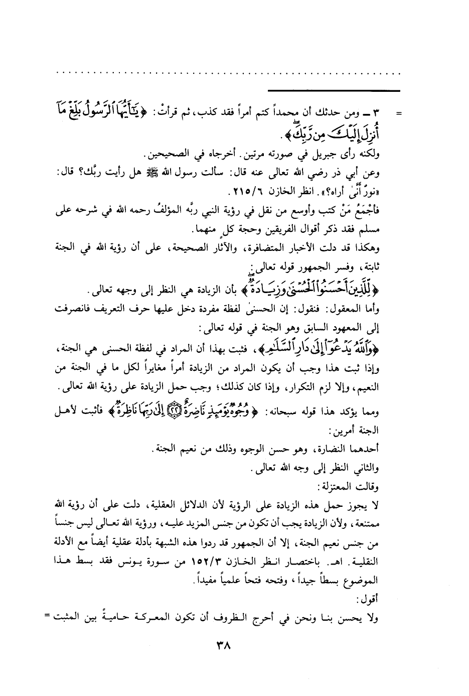 وقالت المعتزلة: لا يجوز حمل هذه الزيادة على الرؤية لأن الدلائل العقلية، دلت على أن رؤية الله ممتنعة، ولأن الزيادة يجب أن تكون من جنس المزيد عليه، ورؤية الله تعالى ليس جنسًا من جنس نعيم الجنة، إلا أن الجمهور قد ردوا هذه الشبهة بأدلة عقلية أيضًا مع الأدلة النقلية. اهـ. باختصار انظر الخازن 3/ 152 من سورة يونس فقد بسط هذا الموضوع بسطًا جيدًا، وفتحه فتحًا علميًا مفيدًا.