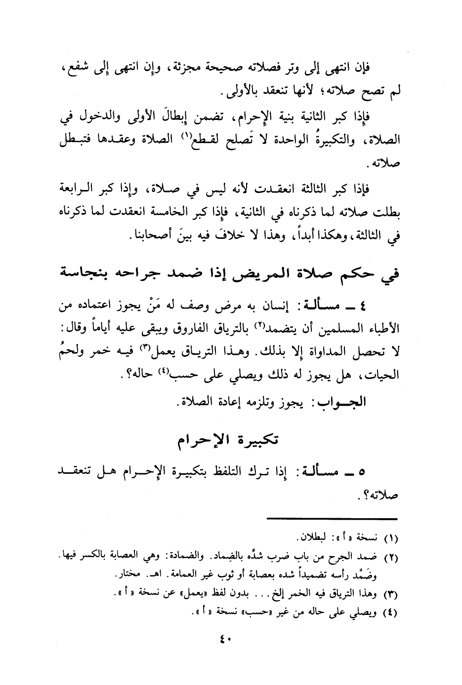 4 - مسألة: إنسان به مرض وصف له مَنْ يجوز اعتماده من الأطباء المسلمين أن يتضمد (¬2) بالترياق الفاروق ويبقى عليه أيامًا وقال: لا تحصل المداواة إِلا بذلك. وهذا الترياق يعمل (¬3) فيه خمر ولحمُ الحيات، هل يجوز له ذلك ويصلي على حسب (¬4) حاله؟.
