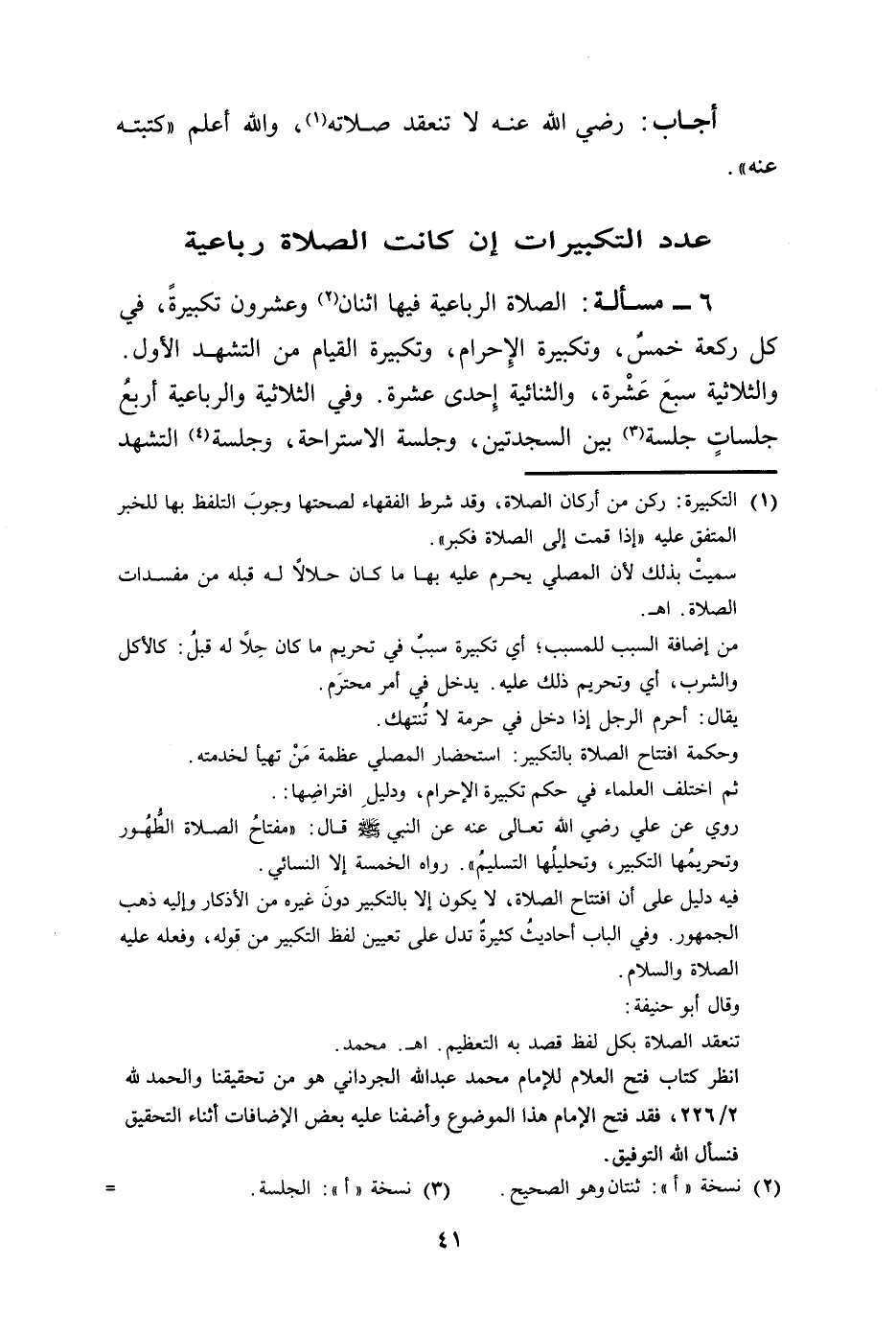 6 - مسألة: الصلاة الرباعية فيها اثنان (¬2) وعشرون تكبيرةً، في كل ركعة خمسٌ، وتكبيرة الإِحرام، وتكبيرة القيام من التشهد الأول.