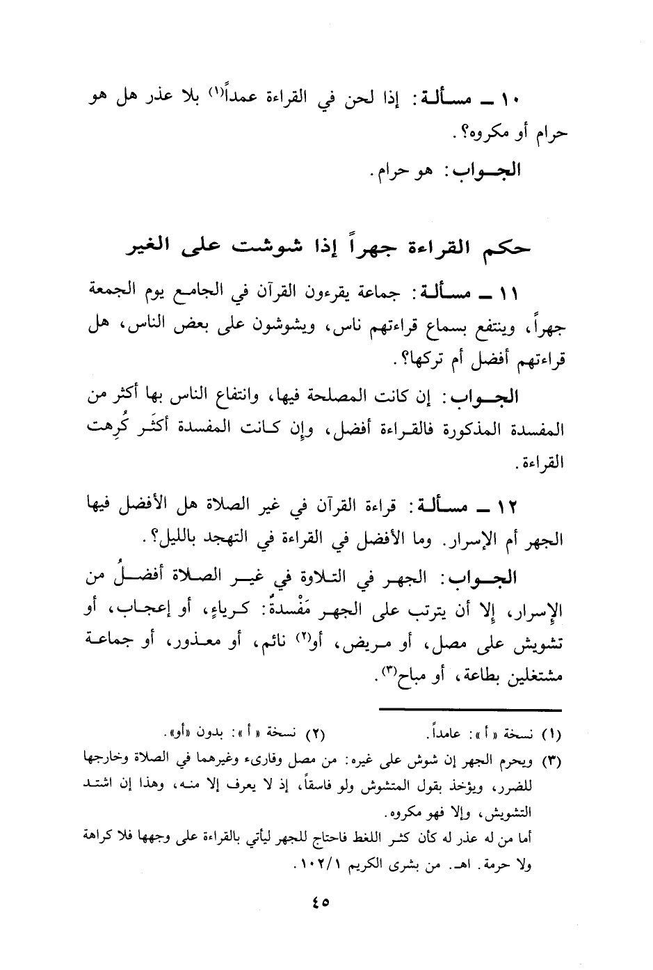 11 - مسألة: جماعة يقرءون القرآن في الجامع يوم الجمعة جهرًا، وينتفع بسماع قراءتهم ناس، ويشوشون على بعض الناس، هل قراءتهم أفضل أم تركها؟.
