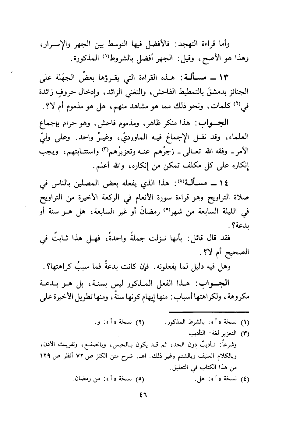 14 - مسألة (¬4): هذا الذي يفعله بعض المصلين بالناس في صلاة التراويح وهو قراءة سورة الأنعام في الركعة الأخيرة من التراويح في الليلة السابعة من شهر (¬5) رمضانَ أو غير السابعة، هل هو سنة أو بدعة؟.