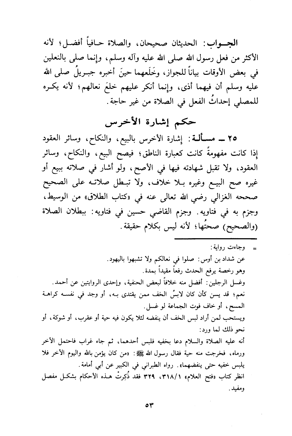 25 - مسألة: إِشارة الأخرس بالبيع، والنكاح، وسائر العقود إِذا كانت مفهومةً كانت كعبارة الناطق؛ فيصح البيع، والنكاح، وسائر العقود، ولا تقبل شهادته فيها في الأصح، ولو أشار في صلاته ببيع أو غيره صح البيع وغيره بلا خلاف، ولا تبطل صلاته على الصحيح صححه الغزالي رضي الله تعالى عنه في "كتاب الطلاق" من الوسيط، وجزم به في فتاويه. وجزم القاضي حسين في فتاويه: ببطلان الصلاة (والصحيح) صحتُها؛ لأنه ليس بكلام حقيقة.
