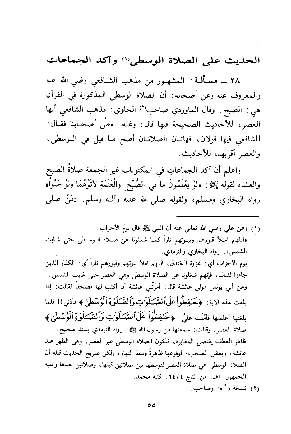 (¬1) وعن علي رضي الله تعالى عنه أن النبي - صلى الله عليه وسلم - قال يومَ الأحزاب: "اللهم املأ قبورهم وبيوتهم نارًا كما شغلونا عن صلاة الوسطى حتى غابت الشمس". رواه البخاري والترمذي.