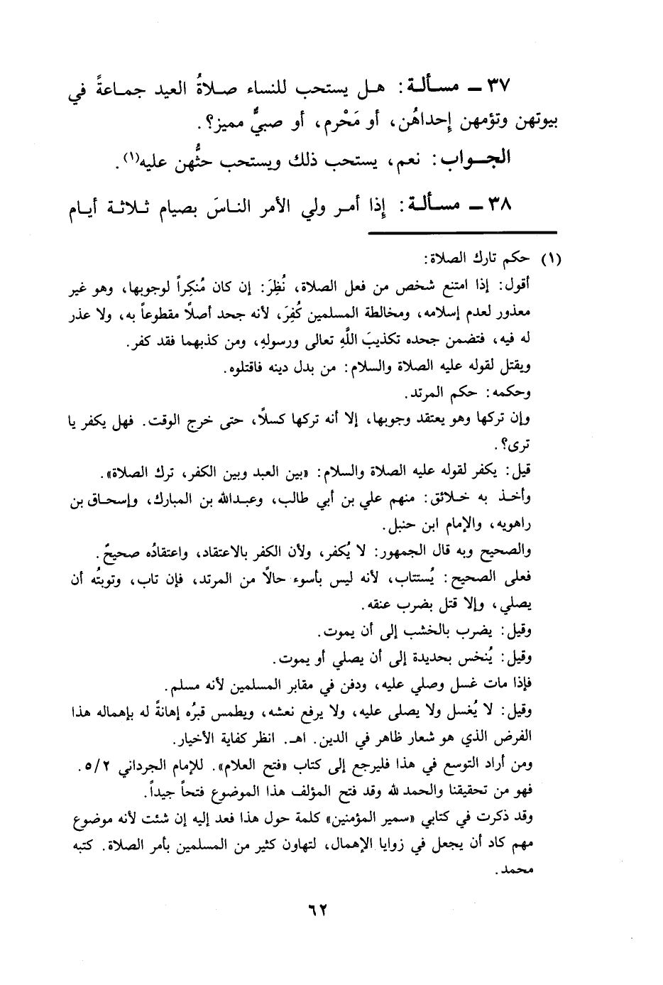 37 - مسألة: هل يستحب للنساء صلاةُ العيد جماعةً في بيوتهن وتؤمهن إِحداهُن، أو مَحْرم، أو صبيٌّ مميز؟.