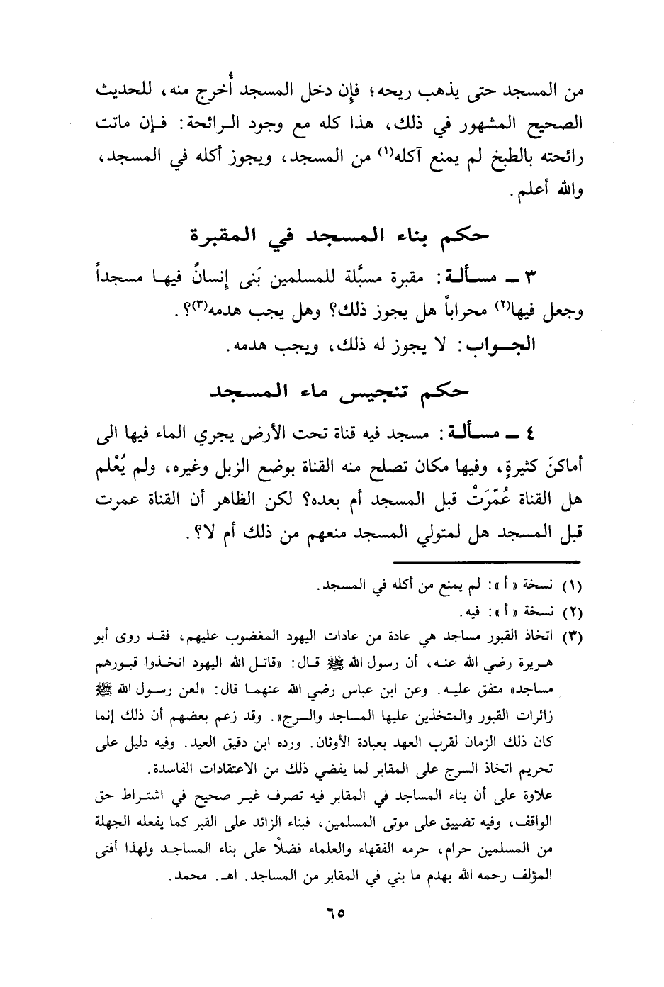 علاوة على أن بناء المساجد في المقابر فيه تصرف غير صحيح في اشتراط حق الواقف، وفيه تضييق على موتى المسلمين، فبناء الزائد على القبر كما يفعله الجهلة من المسلمين حرام، حرمه الفقهاء والعلماء فضلًا على بناء المساجد ولهذا أفتى المؤلف رحمه الله بهدم ما بني في المقابر من المساجد. اهـ. محمد.