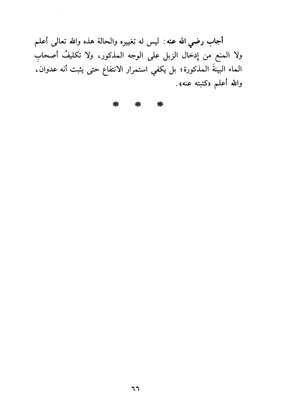 أجاب رضي الله عنه: ليس له تغييره والحالة هذه والله تعالى أعلم ولا المنع من إِدخال الزبل على الوجه المذكور، ولا تكليفُ أصحابِ الماء البينةَ المذكورة؛ بل يكفي استمرار الانتفاع حتى يثبت أنه عدوان، والله أعلم "كتبته عنه".
