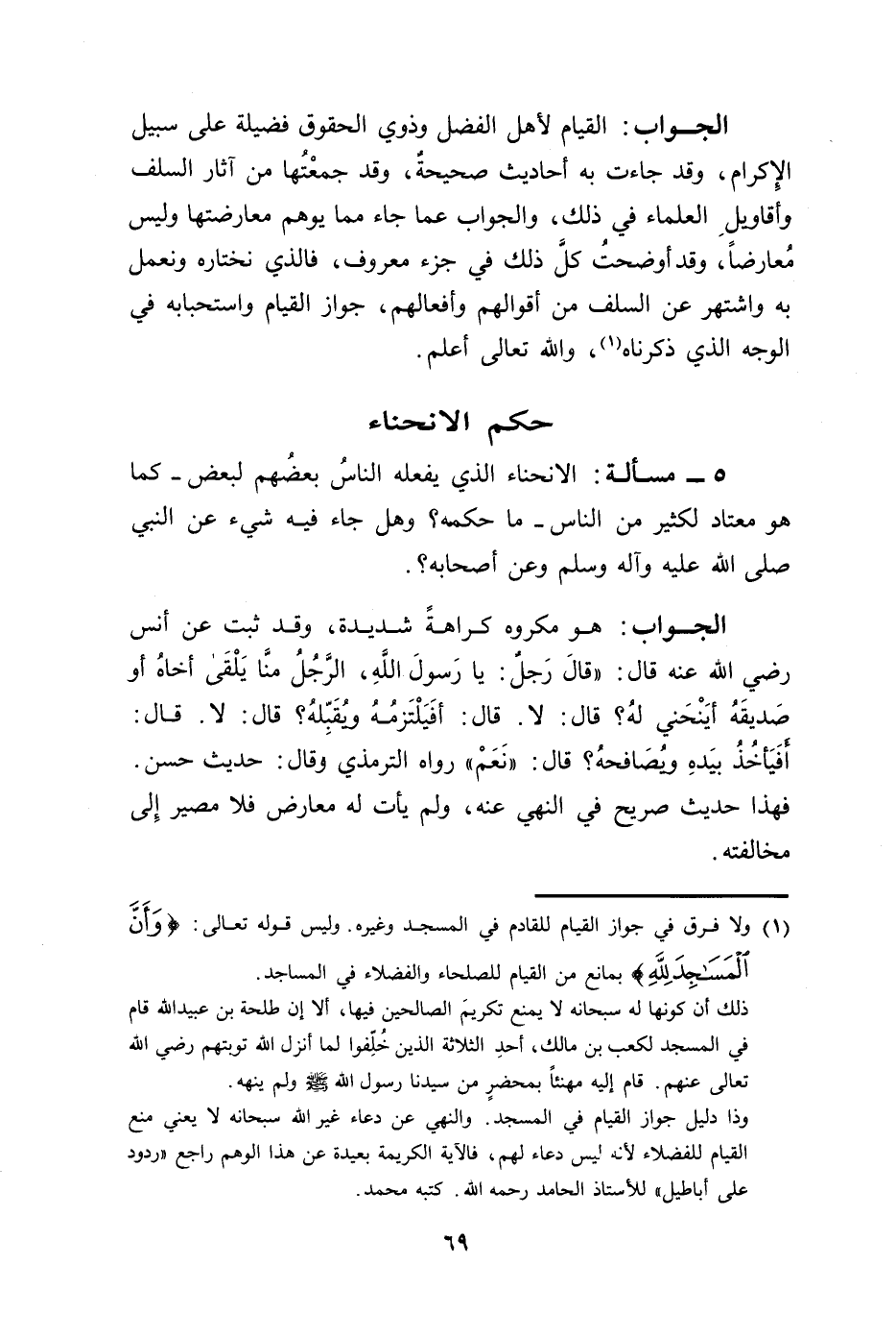 5 - مسألة: الانحناء الذي يفعله الناسُ بعضُهم لبعض -كما هو معتاد لكثير من الناس- ما حكمه؟ وهل جاء فيه شيء عن النبي صلى الله عليه وآله وسلم وعن أصحابه؟.