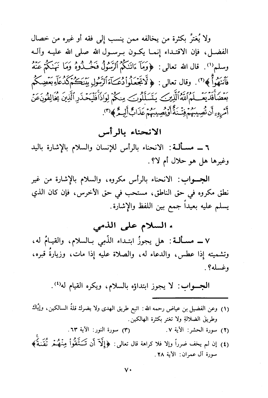 6 - مسألة: الانحناء بالرأس للإنسان والسلام بالِإشارة باليد وغيرها هل هو حلال أم لا؟.