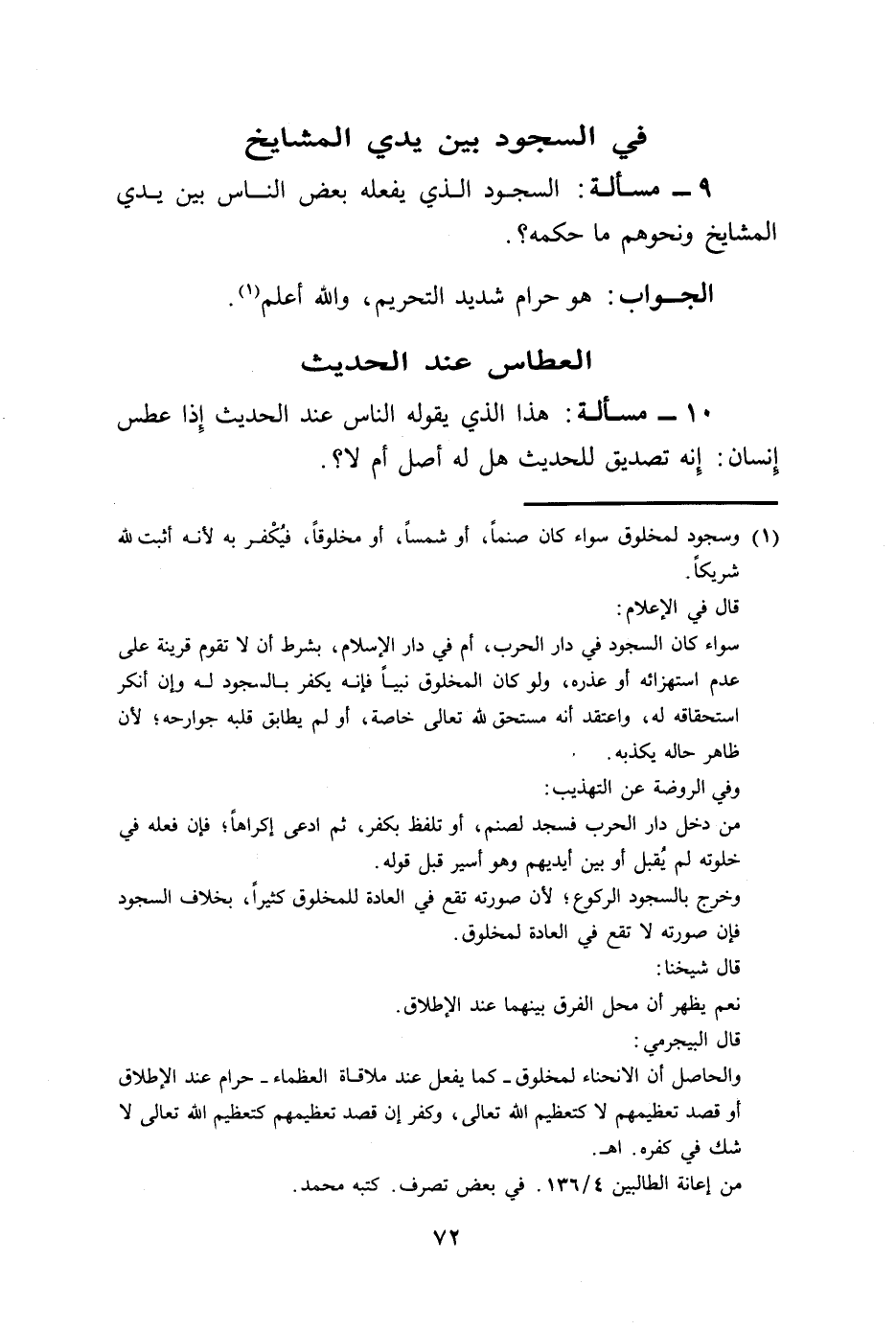 9 - مسألة: السجود الذي يفعله بعض الناس بين يدي المشايخ ونحوهم ما حكمه؟.