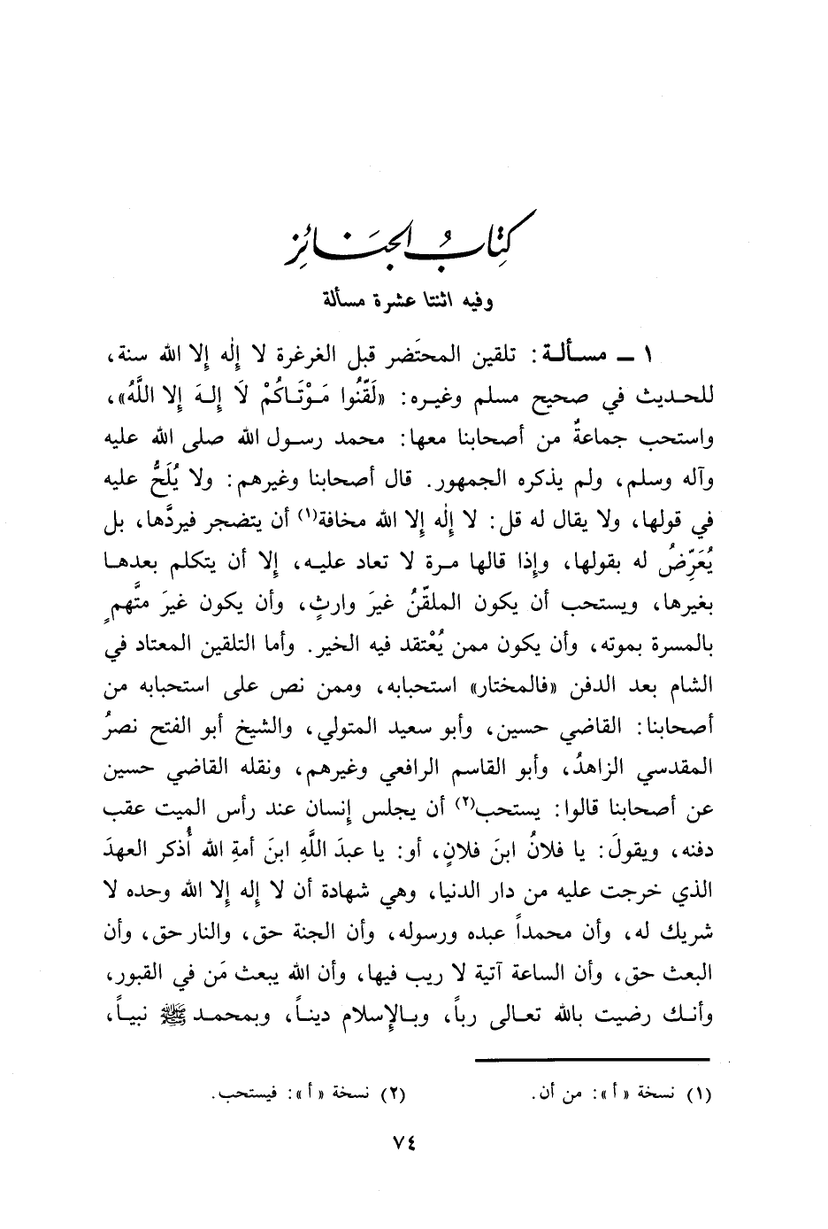 1 - مسألة: تلقين المحتَضر قبل الغرغرة لا إِله إِلا الله سنة، للحديث في صحيح مسلم وغيره: "لَقنُوا مَوْتَاكُمْ لاَ إِلهَ إِلا اللَّهُ"، واستحب جماعةٌ من أصحابنا معها: محمد رسول الله صلى الله عليه وآله وسلم، ولم يذكره الجمهور. قال أصحابنا وغيرهم: ولا يُلَحُّ عليه في قولها، ولا يقال له قل: لا إِله إِلا الله مخافة (¬1) أن يتضجر فيردَّها، بل يُعَرِّضُ له بقولها، وإِذا قالها مرة لا تعاد عليه، إِلا أن يتكلم بعدها بغيرها، ويستحب أن يكون الملقّنُ غيرَ وارثٍ، وأن يكون غيرَ متَّهمٍ بالمسرة بموته، وأن يكون ممن يُعْتقد فيه الخير. وأما التلقين المعتاد في الشام بعد الدفن "فالمختار" استحبابه، وممن نص على استحبابه من أصحابنا: القاضي حسين، وأبو سعيد المتولي، والشيخ أبو الفتح نصرُ المقدسي الزاهدُ، وأبو القاسم الرافعي وغيرهم، ونقله القاضي حسين عن أصحابنا قالوا: يستحب (¬2) أن يجلس إِنسان عند رأس الميت عقب دفنه، ويقولَ: يا فلانُ ابنَ فلانٍ، أو: يا عبدَ اللهِ ابنَ أمةِ الله أُذكر العهدَ الذي خرجت عليه من دار الدنيا، وهي شهادة أن لا إِله إِلا الله وحده لا شريك له، وأن محمدًا عبده ورسوله، وأن الجنة حق، والنار حق، وأن البعث حق، وأن الساعة آتية لا ريب فيها، وأن الله يبعث مَن في القبور، وأنك رضيت بالله تعالى ربًا، وبالِإسلام دينًا، وبمحمد - صلى الله عليه وسلم - نبيًا،