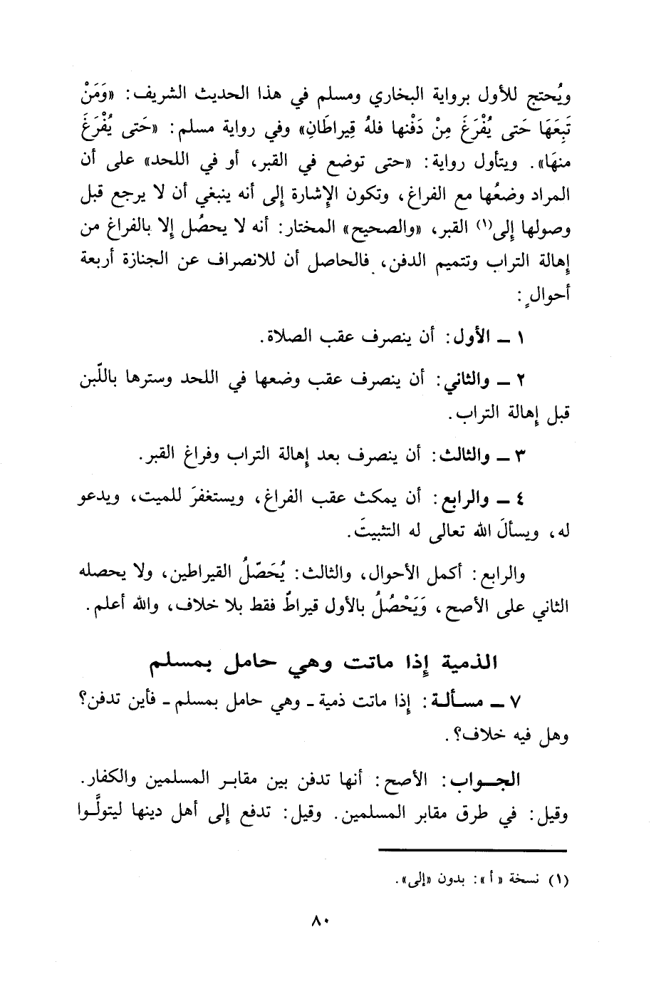 وُيحتج للأول برواية البخاري ومسلم في هذا الحديث الشريف: "وَمَنْ تَبِعَهَا حَتى يُفْرَغَ مِنْ دَفْنها فلهُ قِيراطَانِ" وفي رواية مسلم: "حَتى يُفْرَغَ منهَا". ويتأول رواية: "حتى توضع في القبر، أو في اللحد" على أن المراد وضعُها مع الفراغ، وتكون الِإشارة إِلى أنه ينبغي أن لا يرجع قبل وصولها إِلى (¬1) القبر، "والصحيح" المختار: أنه لا يحصُل إِلا بالفراغ من إِهالة التراب وتتميم الدفن، فالحاصل أن للانصراف عن الجنازة أربعة أحوالٍ:
