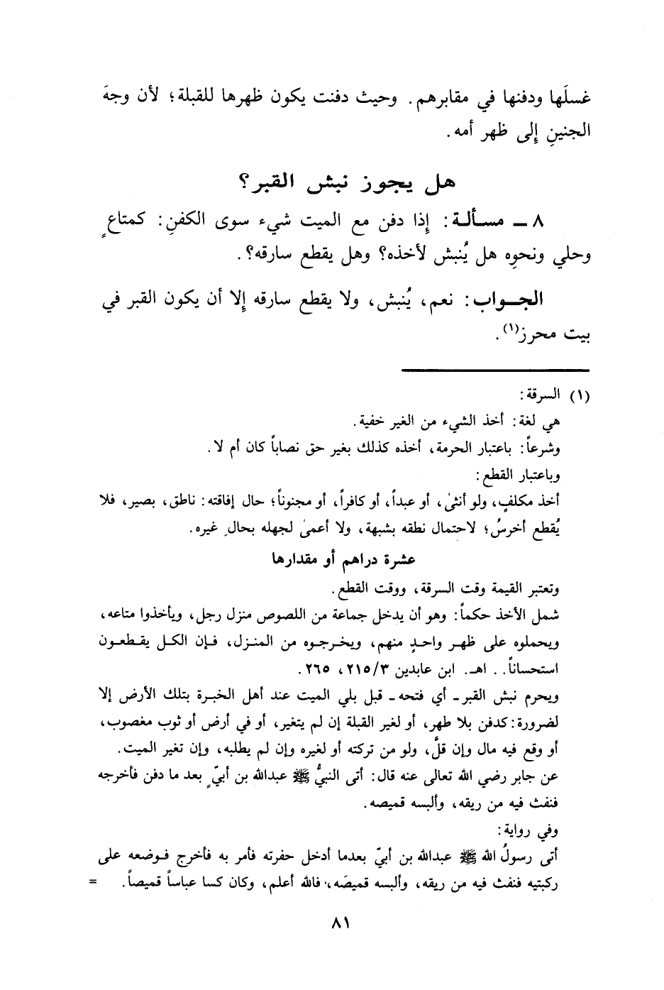 8 - مسألة: إِذا دفن مع الميت شيء سوى الكفنِ: كمتاعٍ وحلي ونحوِه هل يُنبش لأخذه؟ وهل يقطع سارقه؟.