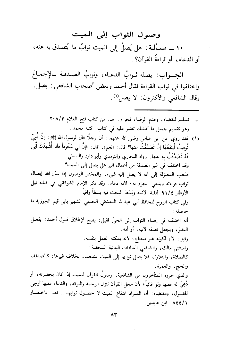 10 - مسألة: هل يَصلُ إِلى الميت ثوابُ ما يُتصدق به عنه، أو الدعاء، أو قراءةُ القرآن؟.