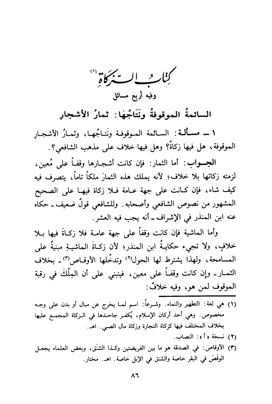 1 - مسألة: السائمة الموقوفة ونَتاجُها، وثمارُ الأشجارِ الموقوفة، هل فيها زكاةٌ؟ وهل فيها خلاف على مذهب الشافعي؟.