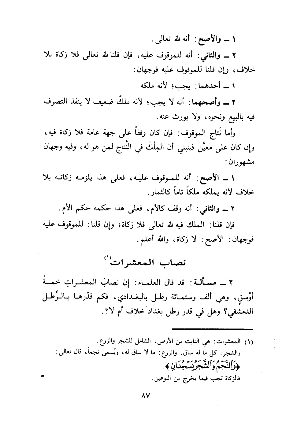 2 - مسأله: قد قال العلماء: إِن نصابَ المعشراتِ خمسةُ أوْسقٍ، وهي ألف وستمائة رطل بالبغدادي، فكم قدْرها بالرطل الدمشقي؟ وهل في قدر رطل بغداد خلاف أم لا؟.
