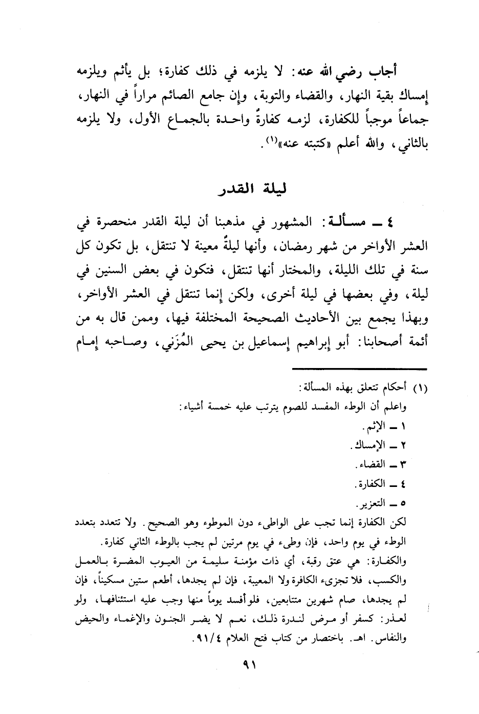 4 - مسألة: المشهور في مذهبنا أن ليلة القدر منحصرة في العشر الأواخر من شهر رمضان، وأنها ليلة معينة لا تنتقل، بل تكون كل سنة في تلك الليلة، والمختار أنها تنتقل، فتكون في بعض السنين في ليلة، وفي بعضها في ليلة أخرى، ولكن إِنما تنتقل في العشر الأواخر، وبهذا يجمع بين الأحاديث الصحيحة المختلفة فيها، وممن قال به من أئمة أصحابنا: أبو إِبراهيم إِسماعيل بن يحيى المُزَني، وصاحبه إِمام