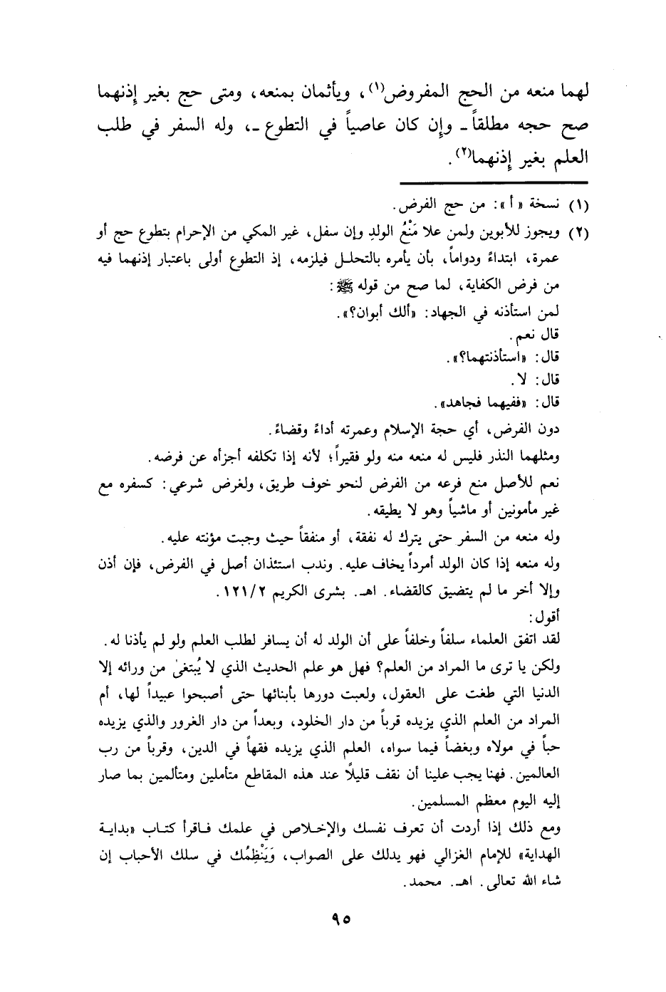 (¬2) ويجوز للأبوين ولمن علا منعُ الولدِ وإن سفل، غير المكي من الإحرام بتطوع حج أو عمرة، ابتداءً ودوامًا، بأن يأمره بالتحلل فيلزمه، إذ التطوع أولى باعتبار إذنهما فيه من فرض الكفاية، لما صح من قوله - صلى الله عليه وسلم -: لمن استأذنه في الجهاد: "ألك أبوان؟ ".