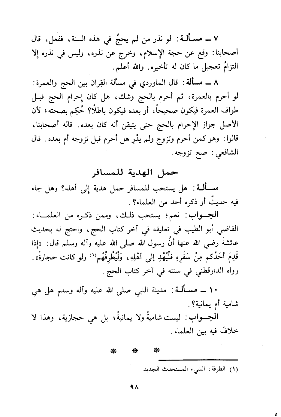 10 - مسألة: مدينة النبي صلى الله عليه وآله وسلم هل هي شامية أم يمانية؟.