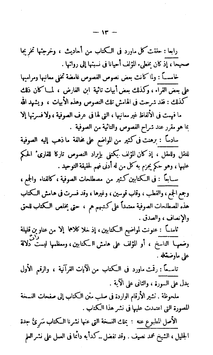 سابعا: في الكتابين كثير من مصطلحات الصوفية، كالفناء والجمع، وجمع الجمع، والقطب، وقاب قوسين، وغيرها، وقد فسرت في هامش الكتاب هذه المصطلحات الصوفية معتمدا على كتبهم هم، حتى يخلص الكتاب للحق والإنصاف، والصدق.