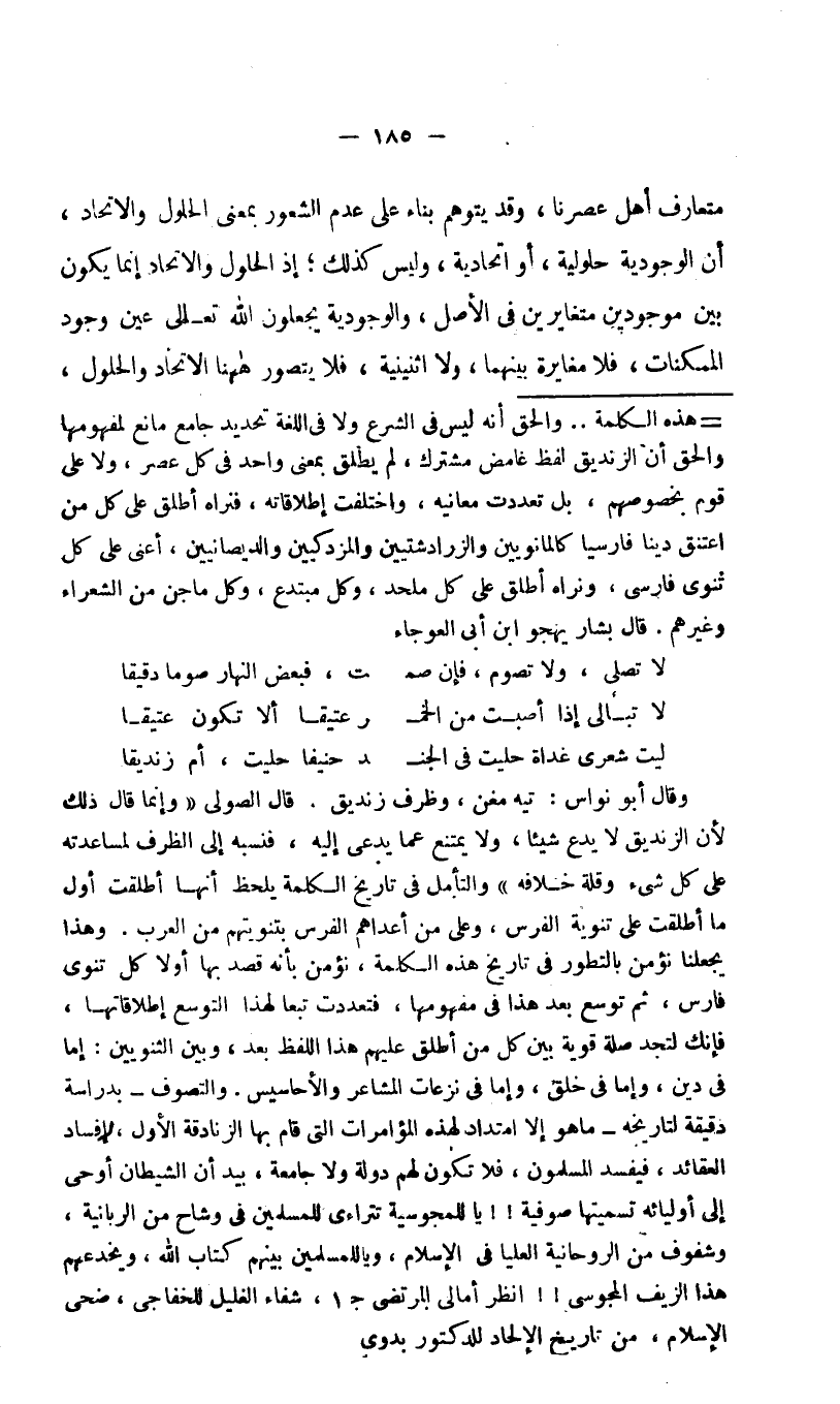 وقال أبو نواس: تيه مغن، وظرف زنديق. قال الصولي "وإنما قال ذلك لأن الزنديق لا يدع شيئا، ولا يمتنع عما يدعى إليه، فنسبه إلى الظرف لمساعدته على كل شيء وقلة خلافه" والتأمل في تاريخ الكلمة يلحظ أنها أطلقت أول ما أطلقت على ثنوية الفرس، وعلى من أعداهم الفرس بثنويتهم من العرب. وهذا يجعلنا نؤمن بالتطور في تاريخ هذه الكلمة، نؤمن بأنه قصد بها أولا كل ثنوي فارس، ثم توسع بعد هذا في مفهومها، فتعددت تبعا لهذا التوسع إطلاقاتها، فإنك لتجد صلة قوية بين كل من أطلق عليهم هذا اللفظ بعد، وبين الثنويين: إما في دين، وإما في خلق، وإما في نزعات المشاعر والأحاسيس. والتصوف -بدراسة دقيقة لتاريخه- ما هو إلا امتداد لهذه المؤامرات التي قام بها الزنادقة الأول, لإفساد العقائد، فيفسد المسلمون، فلا تكون لهم دولة ولا جامعة، بيد أن الشيطان أوحى إلى أوليائه تسميتها صوفية! يا للمجوسية تتراءى للمسلمين في وشاح من الربانية، وشفوف من الروحانية العليا في الإسلام، ويا للمسلمين بينهم كتاب الله، ويخدعهم هذا الزيف المجوسي! انظر أمالي المرتضى جـ1، شفاء الغليل للخفاجي، ضحى الإسلام، من تاريخ الإلحاد للدكتور بدوي.