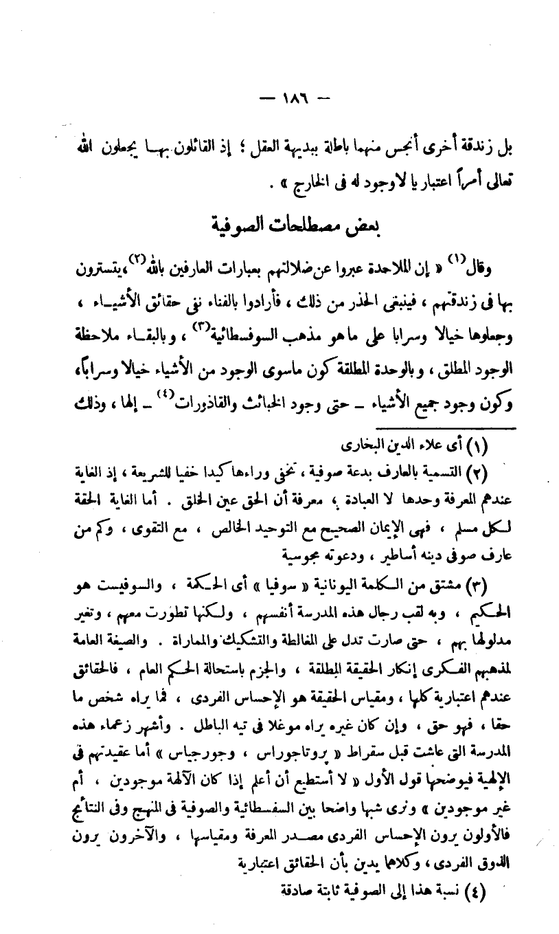 وقال1: "إن الملاحدة عبروا عن ضلالتهم بعبارات العارفين بالله2، يتسترون بها في زندقتهم، فينبغي الحذر من ذلك، فأرادوا بالفناء نفي حقائق الأشياء، وجعلوها خيالا وسرابا على ما هو مذهب السوفسطائية3، وبالبقاء ملاحظة الوجود المطلق، وبالوحدة المطلقة كون ما سوى الوجود من الأشياء خيالا وسرابا، وكون وجود جميع الأشياء -حتى وجود الخبائث والقاذورات4- إلها، وذلك