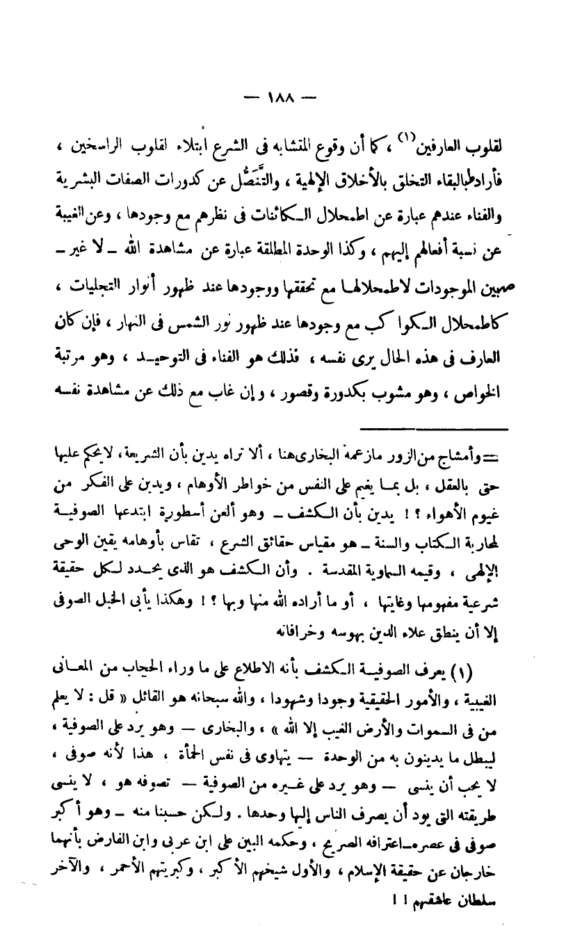 1 يعرف الصوفية الكشف بأنه الاطلاع على ما وراء الحجاب من المعاني الغيبية، والأمور الحقيقية وجودا وشهودا، والله سبحانه هو القائل {قُلْ لا يَعْلَمُ مَنْ فِي السَّمَاوَاتِ وَالْأَرْضِ الْغَيْبَ إِلَّا اللَّهُ} ، والبخاري -وهو يرد على الصوفية، ليبطل ما يدينون به من الوحدة- يتهاوى في نفس الحمأة، هذا لأنه صوفي, لا يحب أن ينسى -وهو يرد على غيره من الصوفية- تصوفه هو، لا ينسى طريقته التي يود أن يصرف الناس إليها وحدها. ولكن حسبنا منه -وهو أكبر صوفي في عصره- اعترافه الصريح، وحكمه البين على ابن عربي وابن الفارض بأنهما خارجان عن حقيقة الإسلام، والأول شيخهم الأكبر، وكبريتهم الأحمر، والآخر سلطان عاشقيهم.