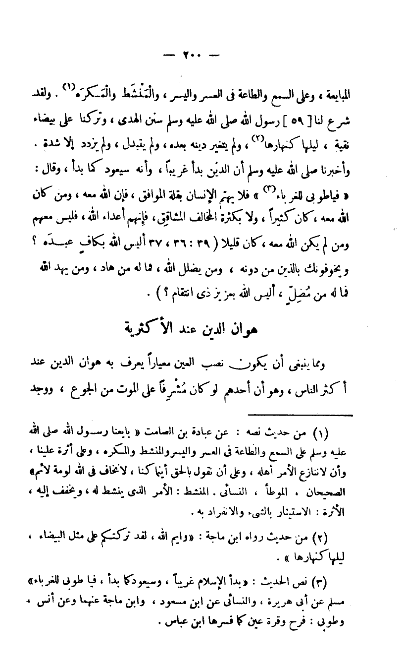 3 نص الحديث: "بدأ الإسلام غريبا، وسيعود كما بدأ، فيا طوبى للغرباء" مسلم عن أبي هريرة، والنسائي عن ابن مسعود، وابن ماجه عنهما وعن أنس، وطوبى: فرح وقرة عين كما فسرها ابن عباس.