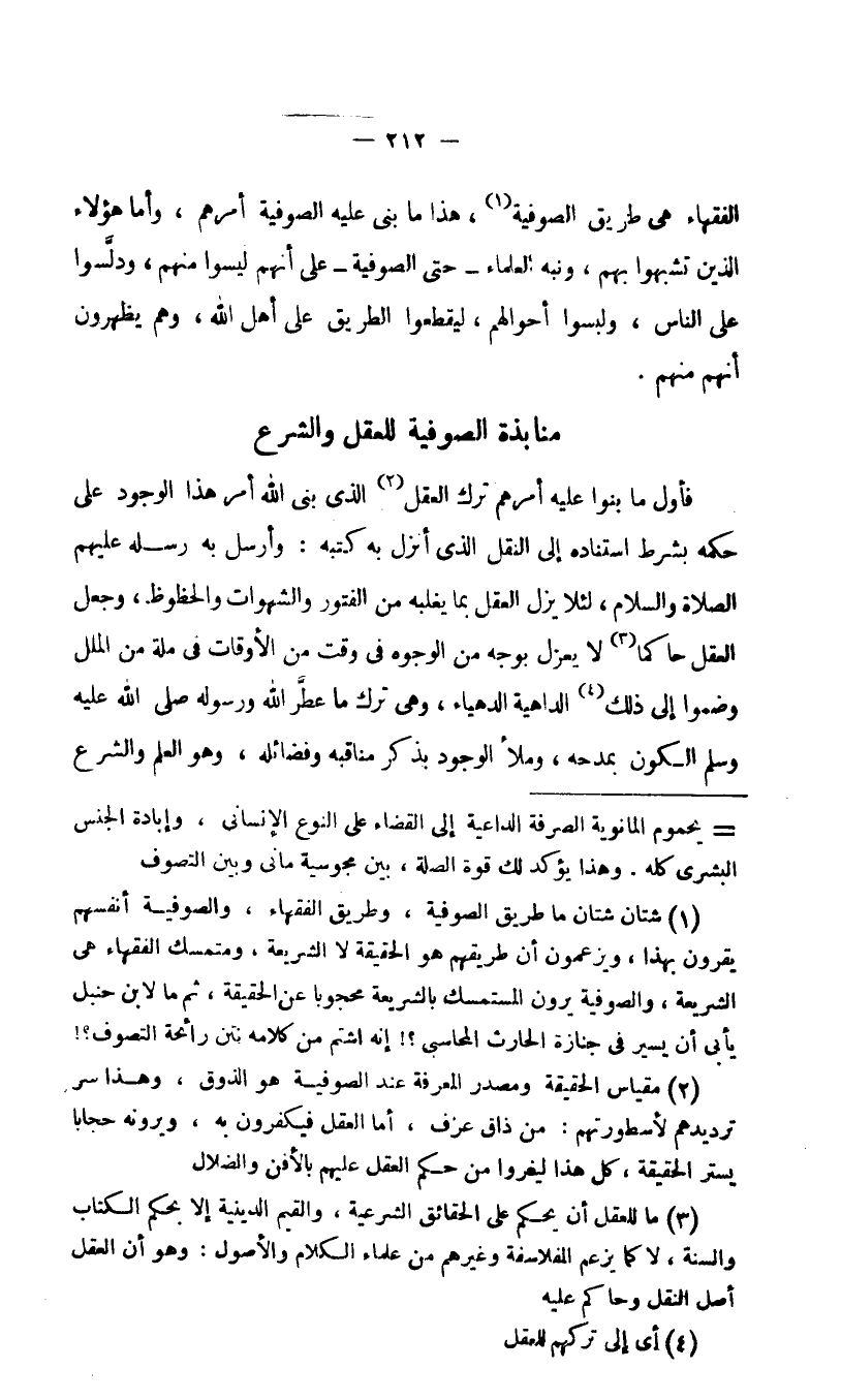 1 شتان شتان ما طريق الصوفية، وطريق الفقهاء، والصوفية أنفسهم يقرون بهذا، ويزعمون أن طريقهم هو الحقيقة لا الشريعة، ومتمسك الفقهاء هي الشريعة، والصوفية يرون المستمسك بالشريعة محجوبا عن الحقيقة، ثم ما لابن حنبل يأبى أن يسير في جنازة الحارث المحاسبي؟! إنه اشتم من كلامه نتن رائحة التصوف؟!