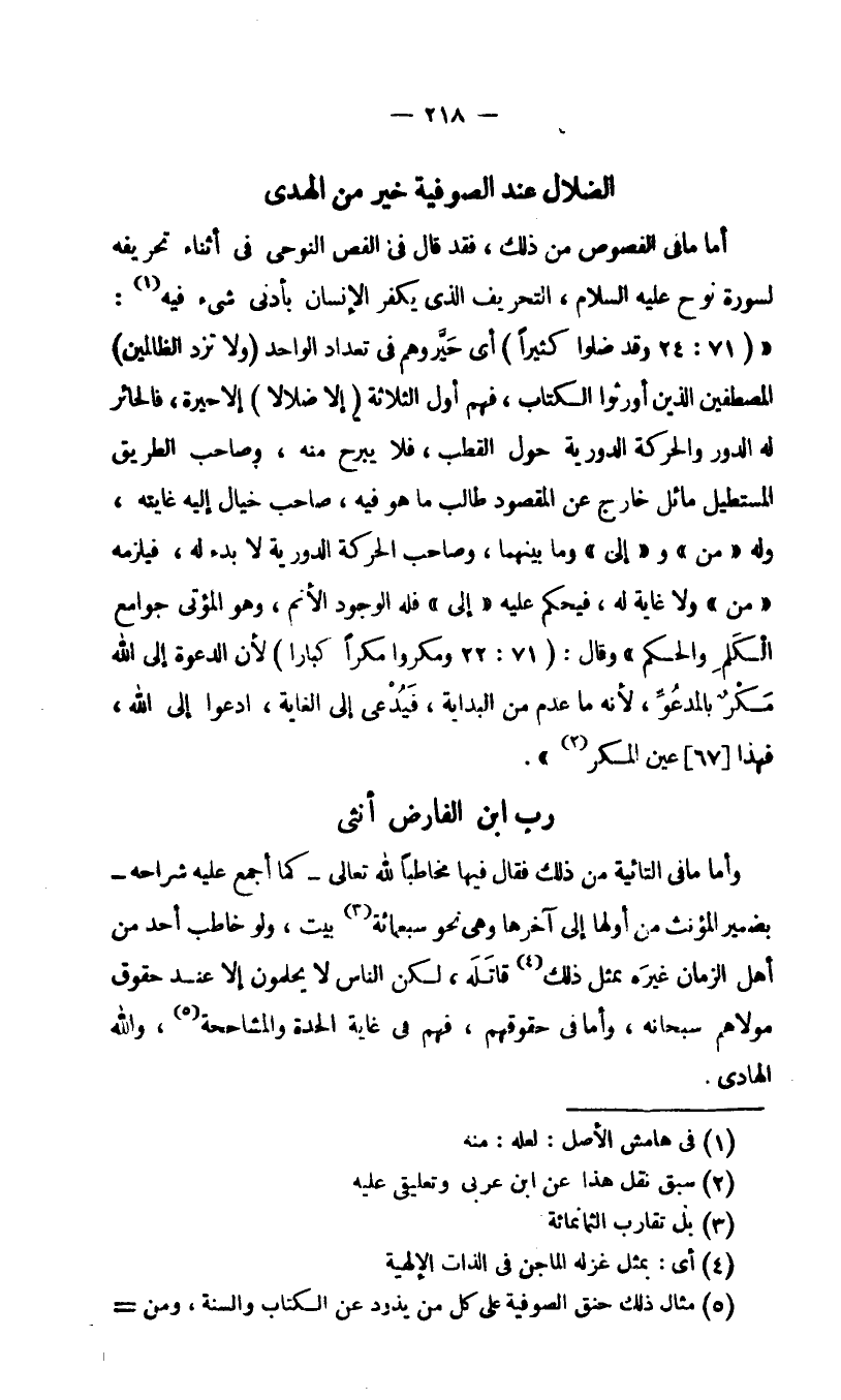 أما ما في الفصوص من ذلك، فقد قال في الفص النوحي في أثناء تحريفه لسورة نوح عليه السلام، التحريف الذي يكفر الإنسان بأدنى شيء فيه1: {وَقَدْ أَضَلُّوا كَثِيرًا} [نوح: 24] أي: حيروهم في تعداد الواحد {وَلا تَزِدِ الظَّالِمِينَ} المصطفين الذين أورثوا الكتاب، فهم أول الثلاثة {إِلَّا ضَلالًا} إلا حيرة، فالحائر له الدور والحركة الدورية حول القطب، فلا يبرح منه، وصاحب الطريق المستطيل مائل خارج عن المقصود طالب ما هو فيه, صاحب خيال إليه غايته, وله "من" و"إلى" وما بينهما، وصاحب الحركة الدورية لا بدء له، فيلزمه "من" ولا غاية له, فيحكم عليه "إلى" فله الوجود الأتم، وهو المؤتى جوامع الكلم والحكم" وقال: {وَمَكَرُوا مَكْرًا كُبَّارًا} [نوح: 22] لأن الدعوة إلى الله مكر بالمدعو؛ لأنه ما عدم من البداية، فيدعى إلى الغاية، ادعوا إلى الله، فهذا [67] عين المكر2.